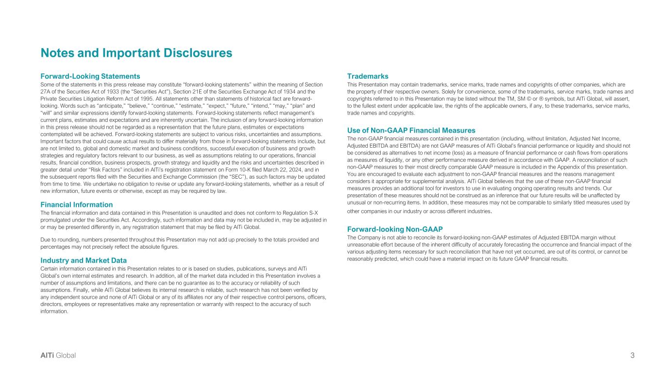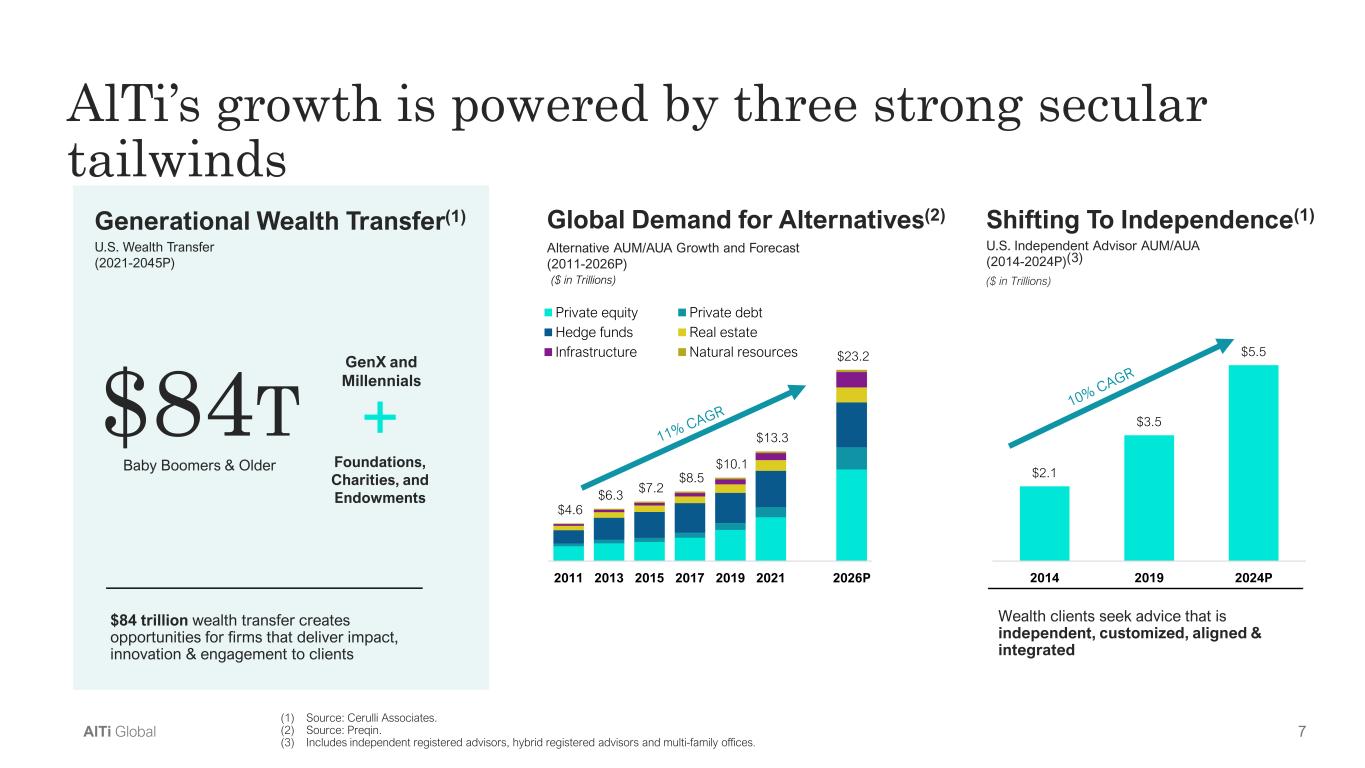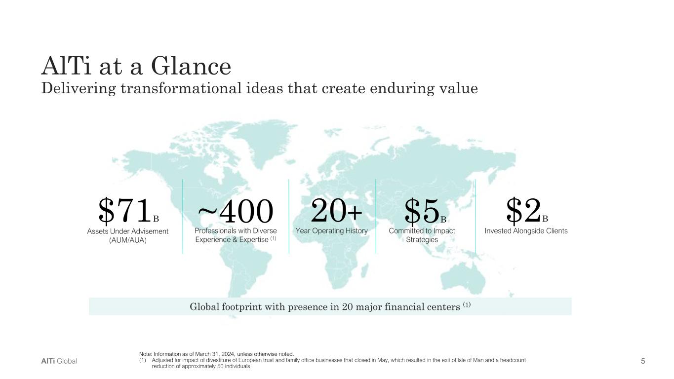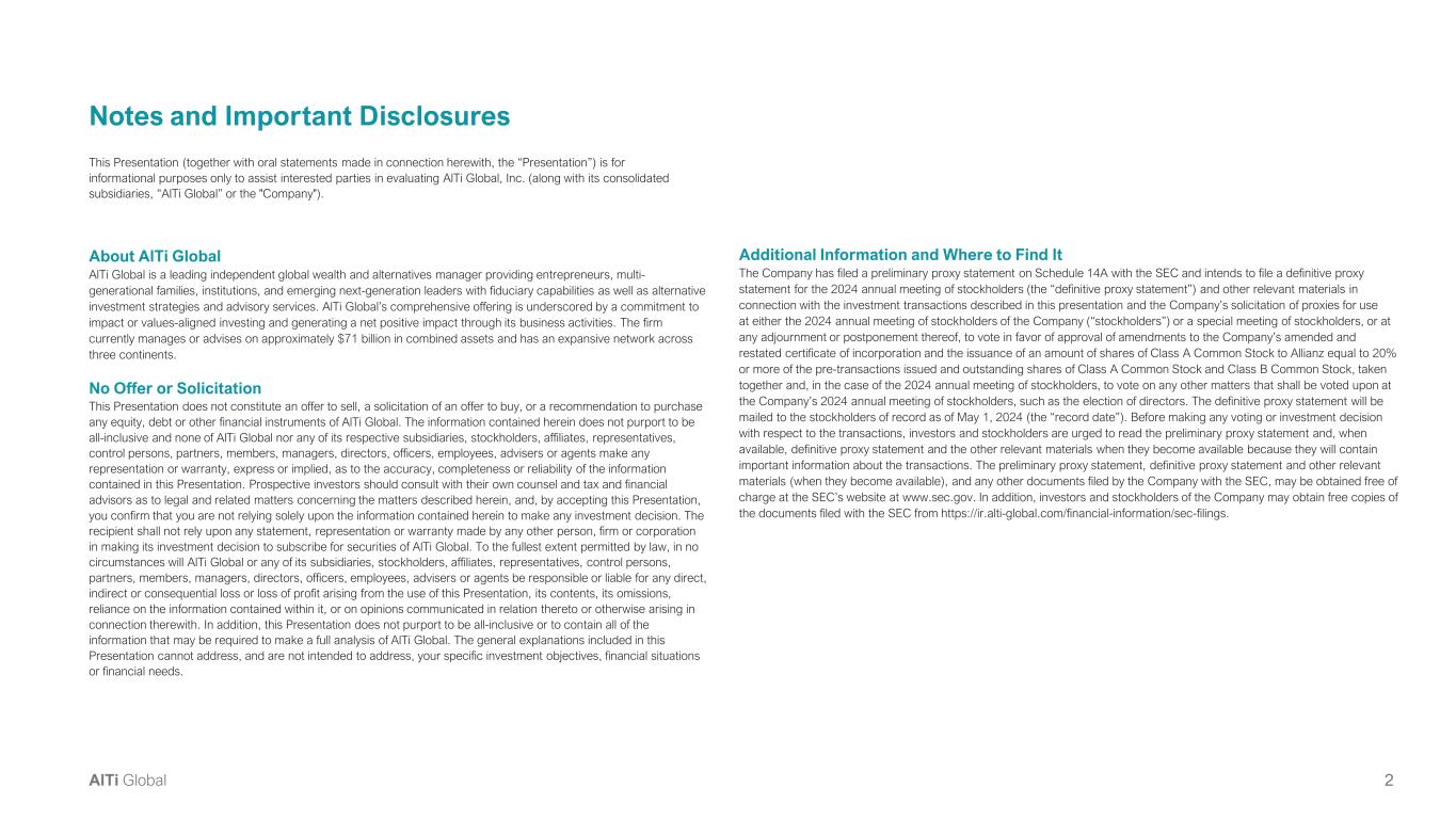 2AlTi Global Notes and Important Disclosures About AlTi Global AlTi Global is a leading independent global wealth and alternatives manager providing entrepreneurs, multi- generational families, institutions, and emerging next-generation leaders with fiduciary capabilities as well as alternative investment strategies and advisory services. AlTi Global’s comprehensive offering is underscored by a commitment to impact or values-aligned investing and generating a net positive impact through its business activities. The firm currently manages or advises on approximately $71 billion in combined assets and has an expansive network across three continents. No Offer or Solicitation This Presentation does not constitute an offer to sell, a solicitation of an offer to buy, or a recommendation to purchase any equity, debt or other financial instruments of AlTi Global. The information contained herein does not purport to be all-inclusive and none of AlTi Global nor any of its respective subsidiaries, stockholders, affiliates, representatives, control persons, partners, members, managers, directors, officers, employees, advisers or agents make any representation or warranty, express or implied, as to the accuracy, completeness or reliability of the information contained in this Presentation. Prospective investors should consult with their own counsel and tax and financial advisors as to legal and related matters concerning the matters described herein, and, by accepting this Presentation, you confirm that you are not relying solely upon the information contained herein to make any investment decision. The recipient shall not rely upon any statement, representation or warranty made by any other person, firm or corporation in making its investment decision to subscribe for securities of AlTi Global. To the fullest extent permitted by law, in no circumstances will AlTi Global or any of its subsidiaries, stockholders, affiliates, representatives, control persons, partners, members, managers, directors, officers, employees, advisers or agents be responsible or liable for any direct, indirect or consequential loss or loss of profit arising from the use of this Presentation, its contents, its omissions, reliance on the information contained within it, or on opinions communicated in relation thereto or otherwise arising in connection therewith. In addition, this Presentation does not purport to be all-inclusive or to contain all of the information that may be required to make a full analysis of AlTi Global. The general explanations included in this Presentation cannot address, and are not intended to address, your specific investment objectives, financial situations or financial needs. This Presentation (together with oral statements made in connection herewith, the “Presentation”) is for informational purposes only to assist interested parties in evaluating AlTi Global, Inc. (along with its consolidated subsidiaries, “AlTi Global” or the "Company"). Additional Information and Where to Find It The Company has filed a preliminary proxy statement on Schedule 14A with the SEC and intends to file a definitive proxy statement for the 2024 annual meeting of stockholders (the “definitive proxy statement”) and other relevant materials in connection with the investment transactions described in this presentation and the Company’s solicitation of proxies for use at either the 2024 annual meeting of stockholders of the Company (“stockholders”) or a special meeting of stockholders, or at any adjournment or postponement thereof, to vote in favor of approval of amendments to the Company’s amended and restated certificate of incorporation and the issuance of an amount of shares of Class A Common Stock to Allianz equal to 20% or more of the pre-transactions issued and outstanding shares of Class A Common Stock and Class B Common Stock, taken together and, in the case of the 2024 annual meeting of stockholders, to vote on any other matters that shall be voted upon at the Company’s 2024 annual meeting of stockholders, such as the election of directors. The definitive proxy statement will be mailed to the stockholders of record as of May 1, 2024 (the “record date”). Before making any voting or investment decision with respect to the transactions, investors and stockholders are urged to read the preliminary proxy statement and, when available, definitive proxy statement and the other relevant materials when they become available because they will contain important information about the transactions. The preliminary proxy statement, definitive proxy statement and other relevant materials (when they become available), and any other documents filed by the Company with the SEC, may be obtained free of charge at the SEC’s website at www.sec.gov. In addition, investors and stockholders of the Company may obtain free copies of the documents filed with the SEC from https://ir.alti-global.com/financial-information/sec-filings.