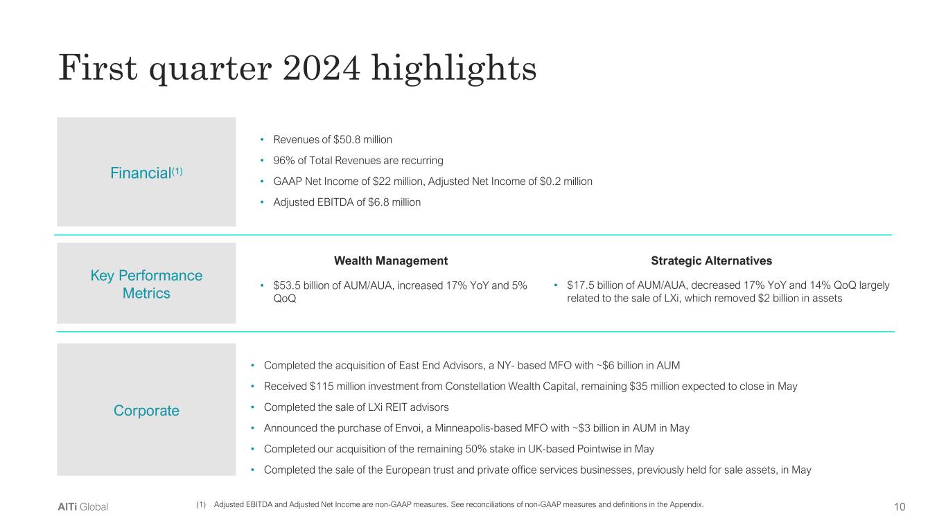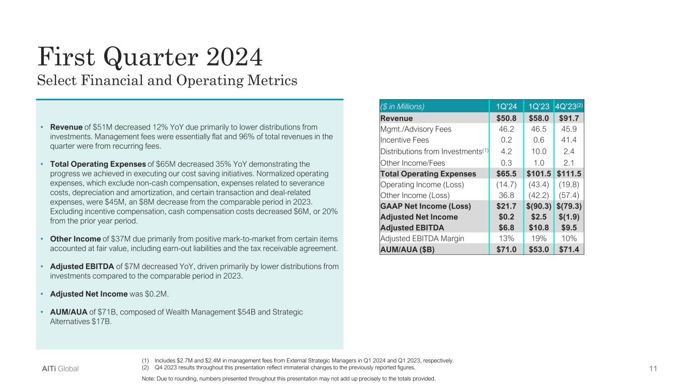 10AlTi Global Financial(1) Key Performance Metrics • Revenues of $50.8 million • 96% of Total Revenues are recurring • GAAP Net Income of $22 million, Adjusted Net Income of $0.2 million • Adjusted EBITDA of $6.8 million First quarter 2024 highlights • $53.5 billion of AUM/AUA, increased 17% YoY and 5% QoQ Wealth Management • $17.5 billion of AUM/AUA, decreased 17% YoY and 14% QoQ largely related to the sale of LXi, which removed $2 billion in assets Strategic Alternatives (1) Adjusted EBITDA and Adjusted Net Income are non-GAAP measures. See reconciliations of non-GAAP measures and definitions in the Appendix. Corporate • Completed the acquisition of East End Advisors, a NY- based MFO with ~$6 billion in AUM • Received $115 million investment from Constellation Wealth Capital, remaining $35 million expected to close in May • Completed the sale of LXi REIT advisors • Announced the purchase of Envoi, a Minneapolis-based MFO with ~$3 billion in AUM in May • Completed our acquisition of the remaining 50% stake in UK-based Pointwise in May • Completed the sale of the European trust and private office services businesses, previously held for sale assets, in May