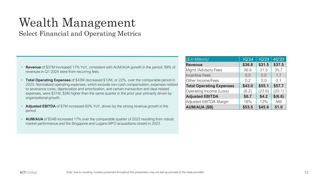 11AlTi Global First Quarter 2024 Select Financial and Operating Metrics • Revenue of $51M decreased 12% YoY due primarily to lower distributions from investments. Management fees were essentially flat and 96% of total revenues in the quarter were from recurring fees. • Total Operating Expenses of $65M decreased 35% YoY demonstrating the progress we achieved in executing our cost saving initiatives. Normalized operating expenses, which exclude non-cash compensation, expenses related to severance costs, depreciation and amortization, and certain transaction and deal-related expenses, were $45M, an $8M decrease from the comparable period in 2023. Excluding incentive compensation, cash compensation costs decreased $6M, or 20% from the prior year period. • Other Income of $37M due primarily from positive mark-to-market from certain items accounted at fair value, including earn-out liabilities and the tax receivable agreement. • Adjusted EBITDA of $7M decreased YoY, driven primarily by lower distributions from investments compared to the comparable period in 2023. • Adjusted Net Income was $0.2M. • AUM/AUA of $71B, composed of Wealth Management $54B and Strategic Alternatives $17B. (1) Includes $2.7M and $2.4M in management fees from External Strategic Managers in Q1 2024 and Q1 2023, respectively. (2) Q4 2023 results throughout this presentation reflect immaterial changes to the previously reported figures. Note: Due to rounding, numbers presented throughout this presentation may not add up precisely to the totals provided. ($ in Millions) 1Q’24 1Q’23 4Q’23(2) Revenue $50.8 $58.0 $91.7 Mgmt./Advisory Fees 46.2 46.5 45.9 Incentive Fees 0.2 0.6 41.4 Distributions from Investments(1) 4.2 10.0 2.4 Other Income/Fees 0.3 1.0 2.1 Total Operating Expenses $65.5 $101.5 $111.5 Operating Income (Loss) (14.7) (43.4) (19.8) Other Income (Loss) 36.8 (42.2) (57.4) GAAP Net Income (Loss) $21.7 $(90.3) $(79.3) Adjusted Net Income $0.2 $2.5 $(1.9) Adjusted EBITDA $6.8 $10.8 $9.5 Adjusted EBITDA Margin 13% 19% 10% AUM/AUA ($B) $71.0 $53.0 $71.4