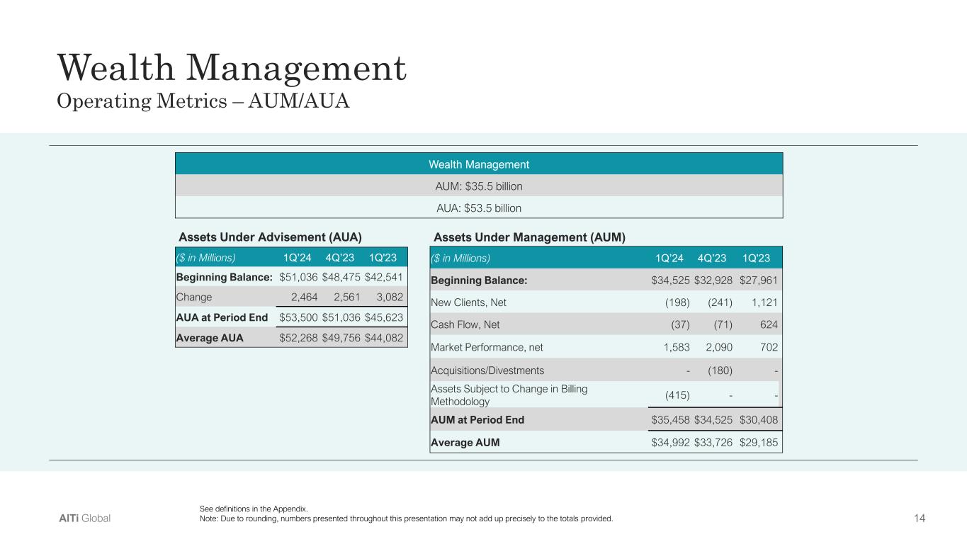13AlTi Global • Revenue of $37M increased 17% YoY, consistent with AUM/AUA growth in the period. 99% of revenues in Q1 2024 were from recurring fees. • Total Operating Expenses of $43M decreased $12M, or 22%, over the comparable period in 2023. Normalized operating expenses, which exclude non-cash compensation, expenses related to severance costs, depreciation and amortization, and certain transaction and deal-related expenses, were $31M, $2M higher than the same quarter in the prior year primarily driven by organizational growth. • Adjusted EBITDA of $7M increased 60% YoY, driven by the strong revenue growth in the period. • AUM/AUA of $54B increased 17% over the comparable quarter of 2023 resulting from robust market performance and the Singapore and Lugano MFO acquisitions closed in 2023. Wealth Management Select Financial and Operating Metrics Note: Due to rounding, numbers presented throughout this presentation may not add up precisely to the totals provided. ($ in Millions) 1Q’24 1Q’23 4Q’23 Revenue $36.8 $31.5 $37.5 Mgmt./Advisory Fees 36.6 31.5 35.7 Incentive Fees 0.0 0.0 1.7 Other Income/Fees 0.2 0.0 0.1 Total Operating Expenses $43.0 $55.1 $57.7 Operating Income (Loss) (6.2) (23.6) (20.1) Adjusted EBITDA $6.7 $4.2 $(6.6) Adjusted EBITDA Margin 18% 13% NM AUM/AUA ($B) $53.5 $45.6 51.0