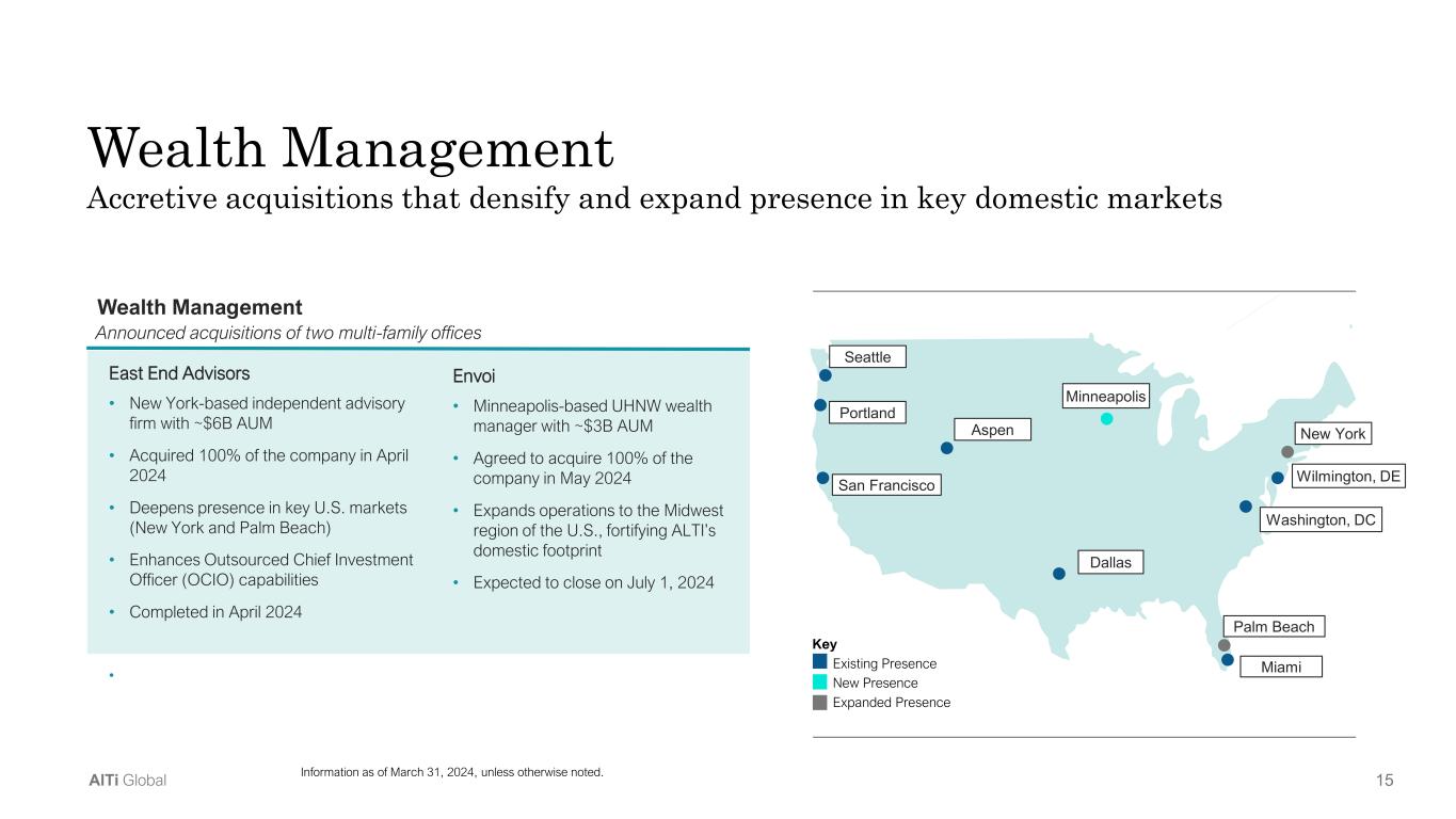 14AlTi Global ($ in Millions) 1Q’24 4Q’23 1Q'23 Beginning Balance: $51,036 $48,475 $42,541 Change 2,464 2,561 3,082 AUA at Period End $53,500 $51,036 $45,623 Average AUA $52,268 $49,756 $44,082 ($ in Millions) 1Q’24 4Q’23 1Q'23 Beginning Balance: $34,525 $32,928 $27,961 New Clients, Net (198) (241) 1,121 Cash Flow, Net (37) (71) 624 Market Performance, net 1,583 2,090 702 Acquisitions/Divestments - (180) - Assets Subject to Change in Billing Methodology (415) - - AUM at Period End $35,458 $34,525 $30,408 Average AUM $34,992 $33,726 $29,185 Wealth Management Operating Metrics – AUM/AUA Assets Under Management (AUM)Assets Under Advisement (AUA) See definitions in the Appendix. Note: Due to rounding, numbers presented throughout this presentation may not add up precisely to the totals provided. Wealth Management AUM: $35.5 billion AUA: $53.5 billion