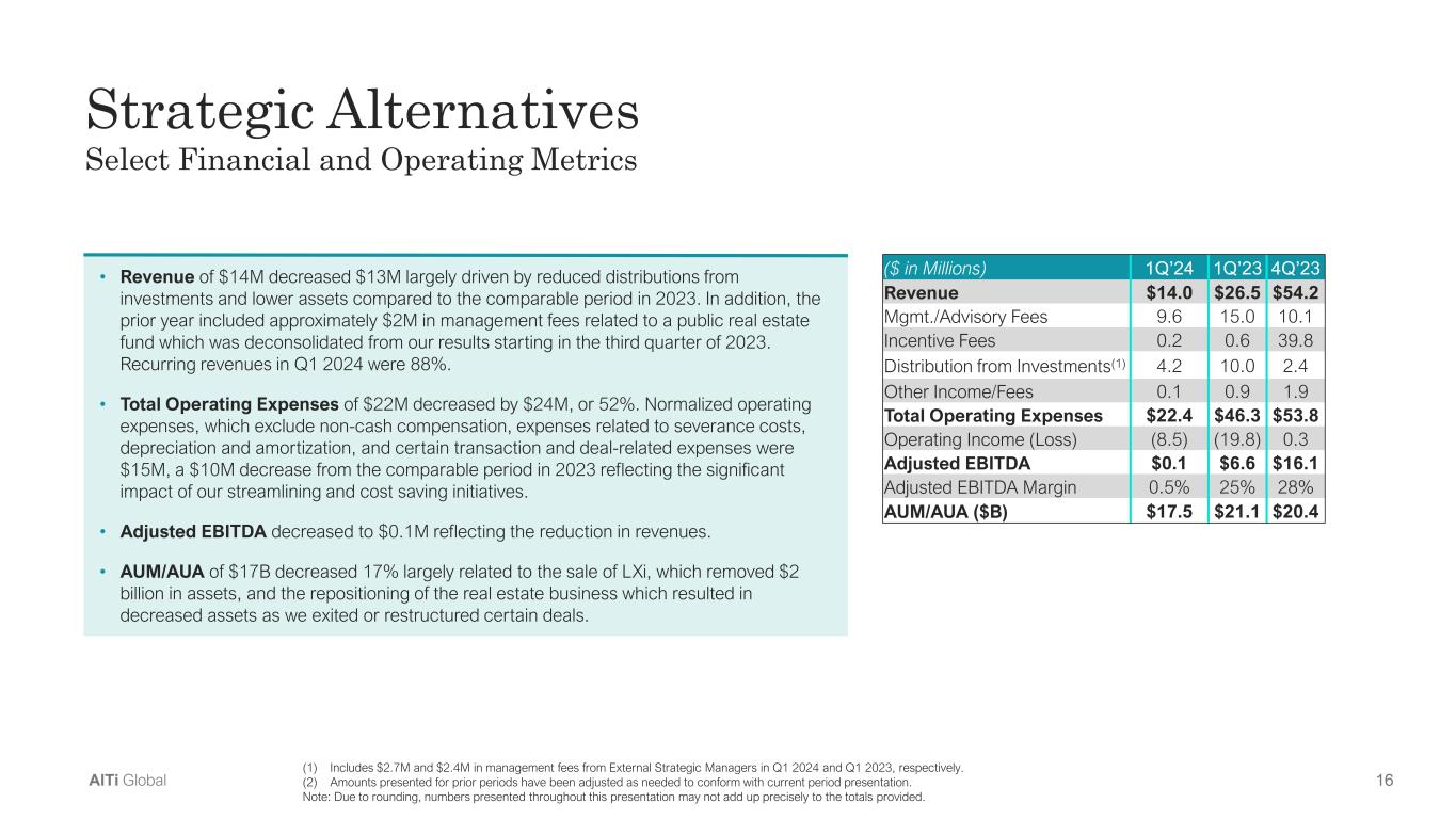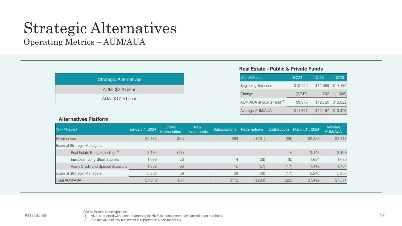 16AlTi Global • Revenue of $14M decreased $13M largely driven by reduced distributions from investments and lower assets compared to the comparable period in 2023. In addition, the prior year included approximately $2M in management fees related to a public real estate fund which was deconsolidated from our results starting in the third quarter of 2023. Recurring revenues in Q1 2024 were 88%. • Total Operating Expenses of $22M decreased by $24M, or 52%. Normalized operating expenses, which exclude non-cash compensation, expenses related to severance costs, depreciation and amortization, and certain transaction and deal-related expenses were $15M, a $10M decrease from the comparable period in 2023 reflecting the significant impact of our streamlining and cost saving initiatives. • Adjusted EBITDA decreased to $0.1M reflecting the reduction in revenues. • AUM/AUA of $17B decreased 17% largely related to the sale of LXi, which removed $2 billion in assets, and the repositioning of the real estate business which resulted in decreased assets as we exited or restructured certain deals. Strategic Alternatives Select Financial and Operating Metrics (1) Includes $2.7M and $2.4M in management fees from External Strategic Managers in Q1 2024 and Q1 2023, respectively. (2) Amounts presented for prior periods have been adjusted as needed to conform with current period presentation. Note: Due to rounding, numbers presented throughout this presentation may not add up precisely to the totals provided. ($ in Millions) 1Q’24 1Q’23 4Q’23 Revenue $14.0 $26.5 $54.2 Mgmt./Advisory Fees 9.6 15.0 10.1 Incentive Fees 0.2 0.6 39.8 Distribution from Investments(1) 4.2 10.0 2.4 Other Income/Fees 0.1 0.9 1.9 Total Operating Expenses $22.4 $46.3 $53.8 Operating Income (Loss) (8.5) (19.8) 0.3 Adjusted EBITDA $0.1 $6.6 $16.1 Adjusted EBITDA Margin 0.5% 25% 28% AUM/AUA ($B) $17.5 $21.1 $20.4