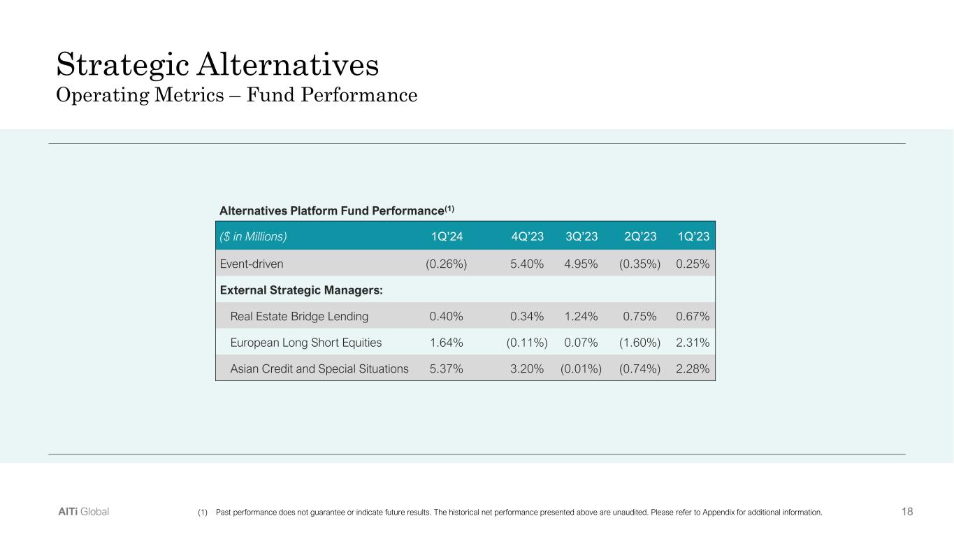 17AlTi Global ($ in Millions) January 1, 2024 Gross Appreciation New Investments Subscriptions Redemptions Distributions March 31, 2024 Average AUM/AUA Event-driven $2,382 $(5) - $83 ($201) ($6) $2,253 $2,318 External Strategic Managers: Real Estate Bridge Lending (2) 2,194 (57) - - - 6 2,143 2,169 European Long Short Equities 1,676 26 - 14 (26) (6) 1,684 1,680 Asian Credit and Special Situations 1,388 90 - 15 (57) (17) 1,419 1,404 External Strategic Managers 5,258 59 - 29 (83) (17) 5,246 5,253 Total AUM/AUA $7,640 $54 - $112 ($284) ($23) $7,499 $7,571 ($ in Millions) 1Q’24 4Q’23 1Q’23 Beginning Balance: $12,720 $11,989 $14,130 Change (2,747) 742 (1,308) AUM/AUA at quarter end (1) $9,973 $12,720 $12,822 Average AUM/AUA $11,347 $12,167 $13,476 Strategic Alternatives Operating Metrics – AUM/AUA Strategic Alternatives AUM: $2.6 billion AUA: $17.5 billion See definitions in the Appendix. (1) AUA is reported with a one-quarter lag for HLIF as management fees are billed on that basis. (2) The fair value of this investment is reported on a one-month lag. Real Estate - Public & Private Funds Alternatives Platform