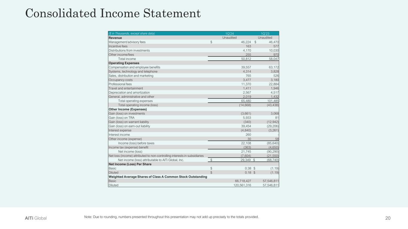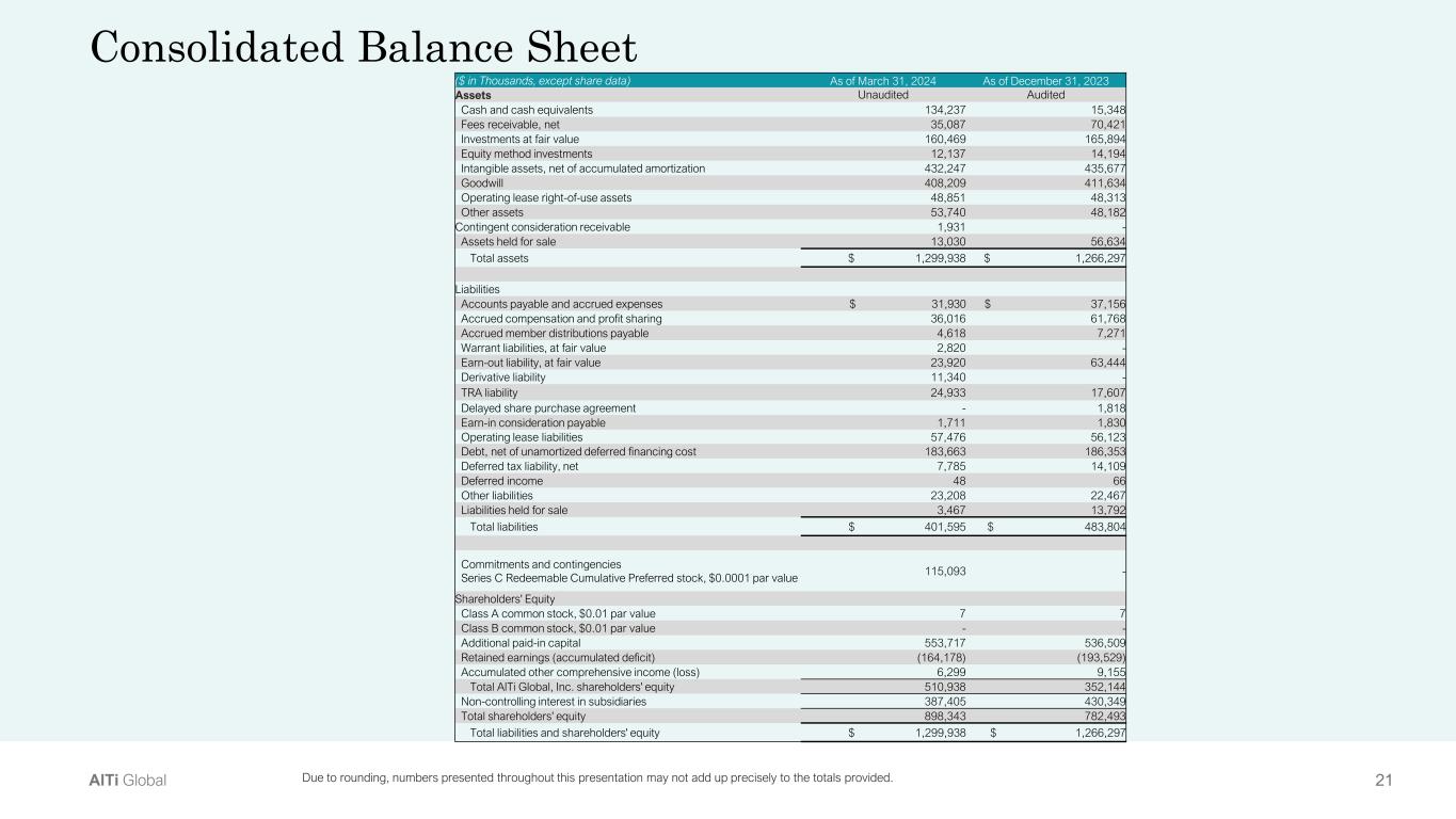 21AlTi Global Consolidated Balance Sheet Due to rounding, numbers presented throughout this presentation may not add up precisely to the totals provided. ($ in Thousands, except share data) As of March 31, 2024 As of December 31, 2023 Assets Unaudited Audited Cash and cash equivalents 134,237 15,348 Fees receivable, net 35,087 70,421 Investments at fair value 160,469 165,894 Equity method investments 12,137 14,194 Intangible assets, net of accumulated amortization 432,247 435,677 Goodwill 408,209 411,634 Operating lease right-of-use assets 48,851 48,313 Other assets 53,740 48,182 Contingent consideration receivable 1,931 - Assets held for sale 13,030 56,634 Total assets $ 1,299,938 $ 1,266,297 Liabilities Accounts payable and accrued expenses $ 31,930 $ 37,156 Accrued compensation and profit sharing 36,016 61,768 Accrued member distributions payable 4,618 7,271 Warrant liabilities, at fair value 2,820 - Earn-out liability, at fair value 23,920 63,444 Derivative liability 11,340 - TRA liability 24,933 17,607 Delayed share purchase agreement - 1,818 Earn-in consideration payable 1,711 1,830 Operating lease liabilities 57,476 56,123 Debt, net of unamortized deferred financing cost 183,663 186,353 Deferred tax liability, net 7,785 14,109 Deferred income 48 66 Other liabilities 23,208 22,467 Liabilities held for sale 3,467 13,792 Total liabilities $ 401,595 $ 483,804 Commitments and contingencies Series C Redeemable Cumulative Preferred stock, $0.0001 par value 115,093 - Shareholders' Equity Class A common stock, $0.01 par value 7 7 Class B common stock, $0.01 par value - - Additional paid-in capital 553,717 536,509 Retained earnings (accumulated deficit) (164,178) (193,529) Accumulated other comprehensive income (loss) 6,299 9,155 Total AlTi Global, Inc. shareholders' equity 510,938 352,144 Non-controlling interest in subsidiaries 387,405 430,349 Total shareholders' equity 898,343 782,493 Total liabilities and shareholders' equity $ 1,299,938 $ 1,266,297