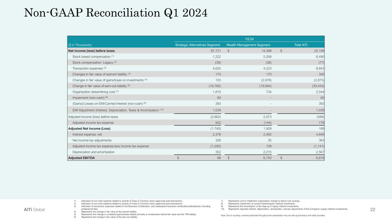 23AlTi Global 1Q’23 ($ in Thousands) Strategic Alternatives Segment Wealth Management Segment Total AlTi Adjusted Net Income and Adjusted EBITDA Net income before taxes $ (38,540) $ (47,100) $ (85,640) Stock based compensation (1) 198 5,640 5,838 Stock based compensation - Legacy (2) 13,148 11,549 24,697 Transaction expenses (3) 9,218 8,555 17,773 Change in fair value of warrant liability (4) 6,471 6,471 12,942 Changes in fair value of (gains)/ losses on investments (5) (3,347) 521 (2,826) Change in fair value of earn-out liability (6) 14,603 14,603 29,206 Organization streamlining cost (7) 385 682 1,067 Adjusted income before taxes 2,136 921 3,057 Adjusted income tax expense (407) (170) (577) Adjusted Net Income 1,729 751 2,480 Interest expense, net 1,753 1,508 3,261 Income tax expense 2,325 2,325 4,650 Adjusted income tax expense less income tax expense (1,918) (2,155) (4,073) Depreciation and amortization 2,739 1,778 4,517 Adjusted EBITDA $ 6,628 $ 4,207 $ 10,835 1) Add-back of non-cash expense related to awards of Class A Common stock (approved post-transaction). 2) Add-back of non-cash expense related to awards of Class A Common stock (approved post-transaction). 3) Add-back of transaction expenses related to the Business Combination, including professional fees. 4) Represents the change in fair value of the warrant liability. 5) Represents the change in unrealized gains/losses related primarily to the interest rate swap. 6) Represents the change in fair value of the earn-out liability. 7) Represents cost to implement organization change to derive cost synergy. Non-GAAP Reconciliation Q1 2023