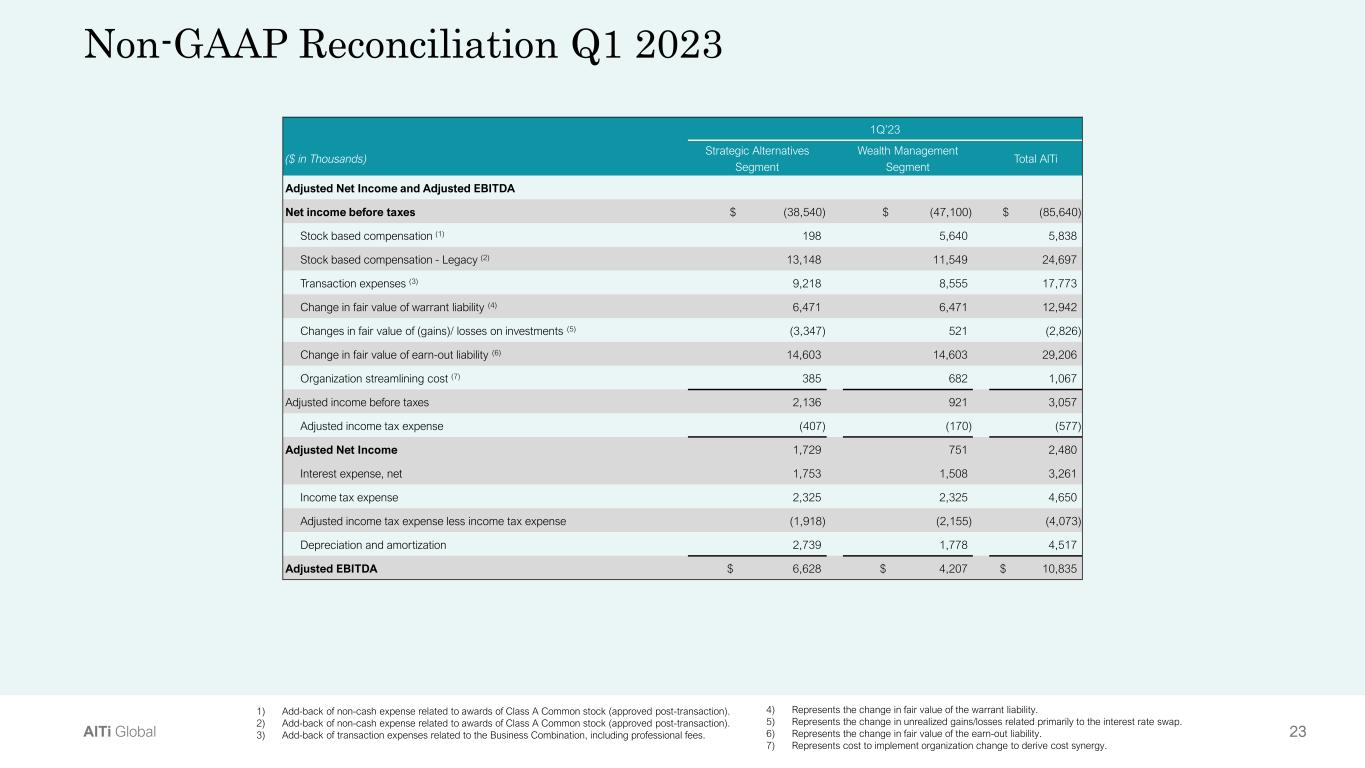 22AlTi Global Non-GAAP Reconciliation Q1 2024 1Q’24 ($ in Thousands) Strategic Alternatives Segment Wealth Management Segment Total AlTi Net income (loss) before taxes $7,721 $ 14,388 $ 22,108 Stock based compensation (1) 1,222 5,268 6,490 Stock compensation- Legacy (2) (39) (38) (77) Transaction expenses (3) 4,620 4,223 8,843 Changes in fair value of warrant liability (4) 170 170 340 Changes in fair value of gains/loses on investments (5) 103 (2,978) (2,875) Change in fair value of earn-out liability (6) (19,760) (19,694) (39,454) Organization streamlining cost (7) 1,810 734 2,544 Impairment (non-cash) (8) 60 - 60 (Gains)/Losses on EMI/Carried Interest (non-cash) (9) 393 - 393 EMI Adjustment (Interest, Depreciation, Taxes & Amortization) (10) 1,039 - 1,039 Adjusted income (loss) before taxes (2,662) 2,073 (589) Adjusted income tax expense 922 (144) 778 Adjusted Net Income (Loss) (1,740) 1,929 189 Interest expense, net 2,378 2,462 4,840 Net income tax adjustments 328 35 363 Adjusted income tax expense less income tax expense (1,250) 109 (1,141) Depreciation and amortization 352 2,215 2,567 Adjusted EBITDA $ 68 $ 6,750 $ 6,818 1) Add-back of non-cash expense related to awards of Class A Common stock (approved post-transaction). 2) Add-back of non-cash expense related to awards of Class A Common stock (approved post-transaction). 3) Add-back of transaction expenses related to the Business Combination, and subsequent business combinations/divestitures including professional fees. 4) Represents the change in fair value of the warrant liability. 5) Represents the change in unrealized gains/losses related primarily to investments held at fair value and the TRA liability. 6) Represents the change in fair value of the earn-out liability. 7) Represents cost to implement organization change to derive cost synergy. 8) Represents impairment of carried interest/equity method investments. 9) Represents the amortization of the step-up in equity method investments. 10) Represents reported interest, depreciation, amortization, and tax adjustments of the Company’s equity method investments. Note: Due to rounding, numbers presented throughout this presentation may not add up precisely to the totals provided.