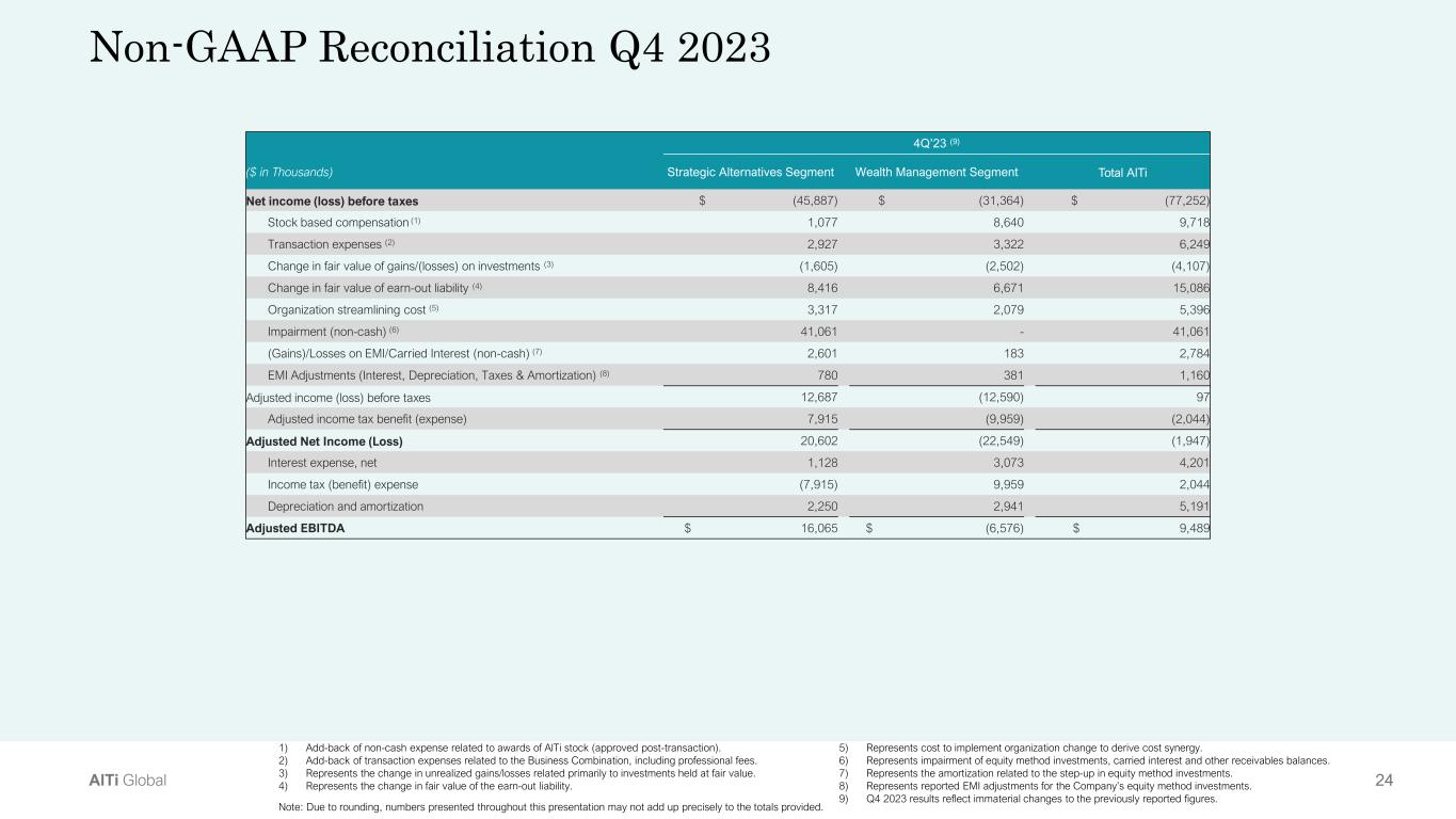 24AlTi Global 4Q’23 (9) ($ in Thousands) Strategic Alternatives Segment Wealth Management Segment Total AlTi Net income (loss) before taxes $ (45,887) $ (31,364) $ (77,252) Stock based compensation (1) 1,077 8,640 9,718 Transaction expenses (2) 2,927 3,322 6,249 Change in fair value of gains/(losses) on investments (3) (1,605) (2,502) (4,107) Change in fair value of earn-out liability (4) 8,416 6,671 15,086 Organization streamlining cost (5) 3,317 2,079 5,396 Impairment (non-cash) (6) 41,061 - 41,061 (Gains)/Losses on EMI/Carried Interest (non-cash) (7) 2,601 183 2,784 EMI Adjustments (Interest, Depreciation, Taxes & Amortization) (8) 780 381 1,160 Adjusted income (loss) before taxes 12,687 (12,590) 97 Adjusted income tax benefit (expense) 7,915 (9,959) (2,044) Adjusted Net Income (Loss) 20,602 (22,549) (1,947) Interest expense, net 1,128 3,073 4,201 Income tax (benefit) expense (7,915) 9,959 2,044 Depreciation and amortization 2,250 2,941 5,191 Adjusted EBITDA $ 16,065 $ (6,576) $ 9,489 Non-GAAP Reconciliation Q4 2023 1) Add-back of non-cash expense related to awards of AlTi stock (approved post-transaction). 2) Add-back of transaction expenses related to the Business Combination, including professional fees. 3) Represents the change in unrealized gains/losses related primarily to investments held at fair value. 4) Represents the change in fair value of the earn-out liability. 5) Represents cost to implement organization change to derive cost synergy. 6) Represents impairment of equity method investments, carried interest and other receivables balances. 7) Represents the amortization related to the step-up in equity method investments. 8) Represents reported EMI adjustments for the Company’s equity method investments. 9) Q4 2023 results reflect immaterial changes to the previously reported figures. Note: Due to rounding, numbers presented throughout this presentation may not add up precisely to the totals provided.