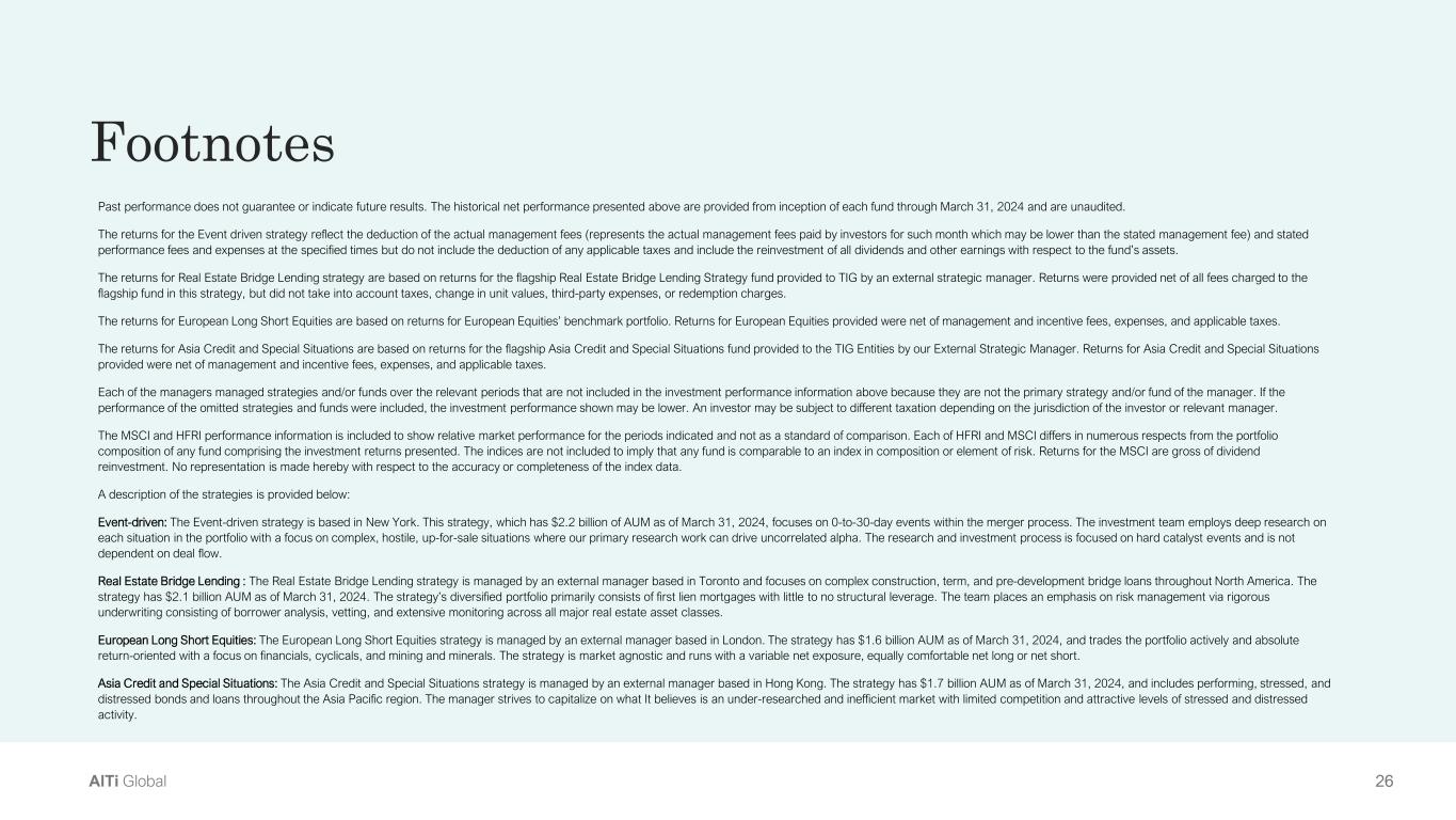 26AlTi Global Footnotes Past performance does not guarantee or indicate future results. The historical net performance presented above are provided from inception of each fund through March 31, 2024 and are unaudited. The returns for the Event driven strategy reflect the deduction of the actual management fees (represents the actual management fees paid by investors for such month which may be lower than the stated management fee) and stated performance fees and expenses at the specified times but do not include the deduction of any applicable taxes and include the reinvestment of all dividends and other earnings with respect to the fund’s assets. The returns for Real Estate Bridge Lending strategy are based on returns for the flagship Real Estate Bridge Lending Strategy fund provided to TIG by an external strategic manager. Returns were provided net of all fees charged to the flagship fund in this strategy, but did not take into account taxes, change in unit values, third-party expenses, or redemption charges. The returns for European Long Short Equities are based on returns for European Equities’ benchmark portfolio. Returns for European Equities provided were net of management and incentive fees, expenses, and applicable taxes. The returns for Asia Credit and Special Situations are based on returns for the flagship Asia Credit and Special Situations fund provided to the TIG Entities by our External Strategic Manager. Returns for Asia Credit and Special Situations provided were net of management and incentive fees, expenses, and applicable taxes. Each of the managers managed strategies and/or funds over the relevant periods that are not included in the investment performance information above because they are not the primary strategy and/or fund of the manager. If the performance of the omitted strategies and funds were included, the investment performance shown may be lower. An investor may be subject to different taxation depending on the jurisdiction of the investor or relevant manager. The MSCI and HFRI performance information is included to show relative market performance for the periods indicated and not as a standard of comparison. Each of HFRI and MSCI differs in numerous respects from the portfolio composition of any fund comprising the investment returns presented. The indices are not included to imply that any fund is comparable to an index in composition or element of risk. Returns for the MSCI are gross of dividend reinvestment. No representation is made hereby with respect to the accuracy or completeness of the index data. A description of the strategies is provided below: Event-driven: The Event-driven strategy is based in New York. This strategy, which has $2.2 billion of AUM as of March 31, 2024, focuses on 0-to-30-day events within the merger process. The investment team employs deep research on each situation in the portfolio with a focus on complex, hostile, up-for-sale situations where our primary research work can drive uncorrelated alpha. The research and investment process is focused on hard catalyst events and is not dependent on deal flow. Real Estate Bridge Lending : The Real Estate Bridge Lending strategy is managed by an external manager based in Toronto and focuses on complex construction, term, and pre-development bridge loans throughout North America. The strategy has $2.1 billion AUM as of March 31, 2024. The strategy’s diversified portfolio primarily consists of first lien mortgages with little to no structural leverage. The team places an emphasis on risk management via rigorous underwriting consisting of borrower analysis, vetting, and extensive monitoring across all major real estate asset classes. European Long Short Equities: The European Long Short Equities strategy is managed by an external manager based in London. The strategy has $1.6 billion AUM as of March 31, 2024, and trades the portfolio actively and absolute return-oriented with a focus on financials, cyclicals, and mining and minerals. The strategy is market agnostic and runs with a variable net exposure, equally comfortable net long or net short. Asia Credit and Special Situations: The Asia Credit and Special Situations strategy is managed by an external manager based in Hong Kong. The strategy has $1.7 billion AUM as of March 31, 2024, and includes performing, stressed, and distressed bonds and loans throughout the Asia Pacific region. The manager strives to capitalize on what It believes is an under-researched and inefficient market with limited competition and attractive levels of stressed and distressed activity.