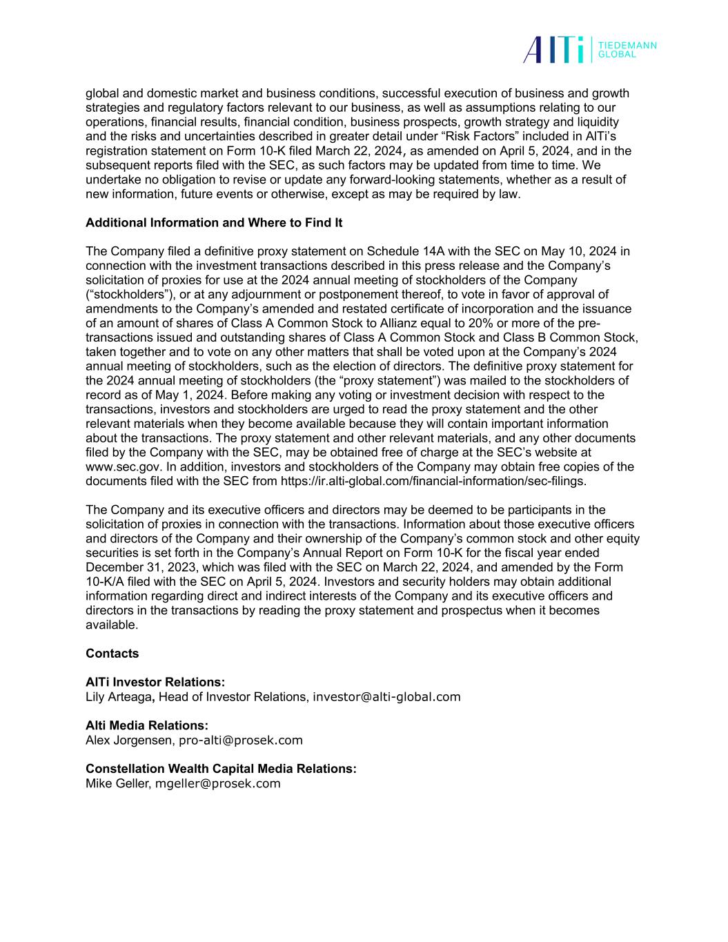 global and domestic market and business conditions, successful execution of business and growth strategies and regulatory factors relevant to our business, as well as assumptions relating to our operations, financial results, financial condition, business prospects, growth strategy and liquidity and the risks and uncertainties described in greater detail under “Risk Factors” included in AlTi’s registration statement on Form 10-K filed March 22, 2024, as amended on April 5, 2024, and in the subsequent reports filed with the SEC, as such factors may be updated from time to time. We undertake no obligation to revise or update any forward-looking statements, whether as a result of new information, future events or otherwise, except as may be required by law. Additional Information and Where to Find It The Company filed a definitive proxy statement on Schedule 14A with the SEC on May 10, 2024 in connection with the investment transactions described in this press release and the Company’s solicitation of proxies for use at the 2024 annual meeting of stockholders of the Company (“stockholders”), or at any adjournment or postponement thereof, to vote in favor of approval of amendments to the Company’s amended and restated certificate of incorporation and the issuance of an amount of shares of Class A Common Stock to Allianz equal to 20% or more of the pre- transactions issued and outstanding shares of Class A Common Stock and Class B Common Stock, taken together and to vote on any other matters that shall be voted upon at the Company’s 2024 annual meeting of stockholders, such as the election of directors. The definitive proxy statement for the 2024 annual meeting of stockholders (the “proxy statement”) was mailed to the stockholders of record as of May 1, 2024. Before making any voting or investment decision with respect to the transactions, investors and stockholders are urged to read the proxy statement and the other relevant materials when they become available because they will contain important information about the transactions. The proxy statement and other relevant materials, and any other documents filed by the Company with the SEC, may be obtained free of charge at the SEC’s website at www.sec.gov. In addition, investors and stockholders of the Company may obtain free copies of the documents filed with the SEC from https://ir.alti-global.com/financial-information/sec-filings. The Company and its executive officers and directors may be deemed to be participants in the solicitation of proxies in connection with the transactions. Information about those executive officers and directors of the Company and their ownership of the Company’s common stock and other equity securities is set forth in the Company’s Annual Report on Form 10-K for the fiscal year ended December 31, 2023, which was filed with the SEC on March 22, 2024, and amended by the Form 10-K/A filed with the SEC on April 5, 2024. Investors and security holders may obtain additional information regarding direct and indirect interests of the Company and its executive officers and directors in the transactions by reading the proxy statement and prospectus when it becomes available. Contacts AlTi Investor Relations: Lily Arteaga, Head of Investor Relations, investor@alti-global.com Alti Media Relations: Alex Jorgensen, pro-alti@prosek.com Constellation Wealth Capital Media Relations: Mike Geller, mgeller@prosek.com