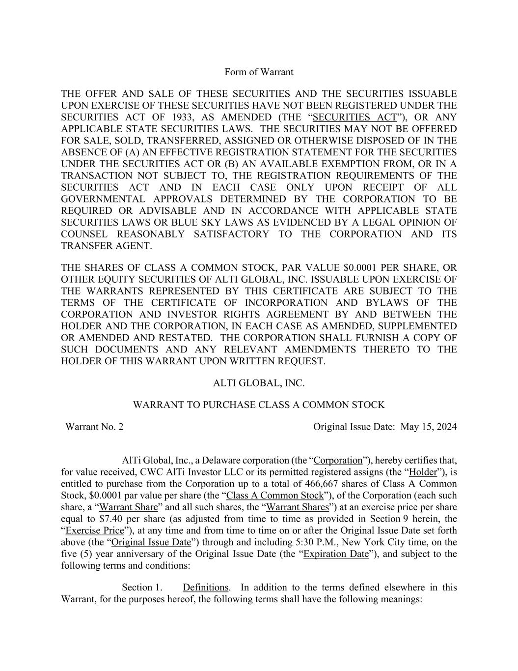 Form of Warrant THE OFFER AND SALE OF THESE SECURITIES AND THE SECURITIES ISSUABLE UPON EXERCISE OF THESE SECURITIES HAVE NOT BEEN REGISTERED UNDER THE SECURITIES ACT OF 1933, AS AMENDED (THE “SECURITIES ACT”), OR ANY APPLICABLE STATE SECURITIES LAWS. THE SECURITIES MAY NOT BE OFFERED FOR SALE, SOLD, TRANSFERRED, ASSIGNED OR OTHERWISE DISPOSED OF IN THE ABSENCE OF (A) AN EFFECTIVE REGISTRATION STATEMENT FOR THE SECURITIES UNDER THE SECURITIES ACT OR (B) AN AVAILABLE EXEMPTION FROM, OR IN A TRANSACTION NOT SUBJECT TO, THE REGISTRATION REQUIREMENTS OF THE SECURITIES ACT AND IN EACH CASE ONLY UPON RECEIPT OF ALL GOVERNMENTAL APPROVALS DETERMINED BY THE CORPORATION TO BE REQUIRED OR ADVISABLE AND IN ACCORDANCE WITH APPLICABLE STATE SECURITIES LAWS OR BLUE SKY LAWS AS EVIDENCED BY A LEGAL OPINION OF COUNSEL REASONABLY SATISFACTORY TO THE CORPORATION AND ITS TRANSFER AGENT. THE SHARES OF CLASS A COMMON STOCK, PAR VALUE $0.0001 PER SHARE, OR OTHER EQUITY SECURITIES OF ALTI GLOBAL, INC. ISSUABLE UPON EXERCISE OF THE WARRANTS REPRESENTED BY THIS CERTIFICATE ARE SUBJECT TO THE TERMS OF THE CERTIFICATE OF INCORPORATION AND BYLAWS OF THE CORPORATION AND INVESTOR RIGHTS AGREEMENT BY AND BETWEEN THE HOLDER AND THE CORPORATION, IN EACH CASE AS AMENDED, SUPPLEMENTED OR AMENDED AND RESTATED. THE CORPORATION SHALL FURNISH A COPY OF SUCH DOCUMENTS AND ANY RELEVANT AMENDMENTS THERETO TO THE HOLDER OF THIS WARRANT UPON WRITTEN REQUEST. ALTI GLOBAL, INC. WARRANT TO PURCHASE CLASS A COMMON STOCK Warrant No. 2 Original Issue Date: May 15, 2024 AlTi Global, Inc., a Delaware corporation (the “Corporation”), hereby certifies that, for value received, CWC AlTi Investor LLC or its permitted registered assigns (the “Holder”), is entitled to purchase from the Corporation up to a total of 466,667 shares of Class A Common Stock, $0.0001 par value per share (the “Class A Common Stock”), of the Corporation (each such share, a “Warrant Share” and all such shares, the “Warrant Shares”) at an exercise price per share equal to $7.40 per share (as adjusted from time to time as provided in Section 9 herein, the “Exercise Price”), at any time and from time to time on or after the Original Issue Date set forth above (the “Original Issue Date”) through and including 5:30 P.M., New York City time, on the five (5) year anniversary of the Original Issue Date (the “Expiration Date”), and subject to the following terms and conditions: Section 1. Definitions. In addition to the terms defined elsewhere in this Warrant, for the purposes hereof, the following terms shall have the following meanings: