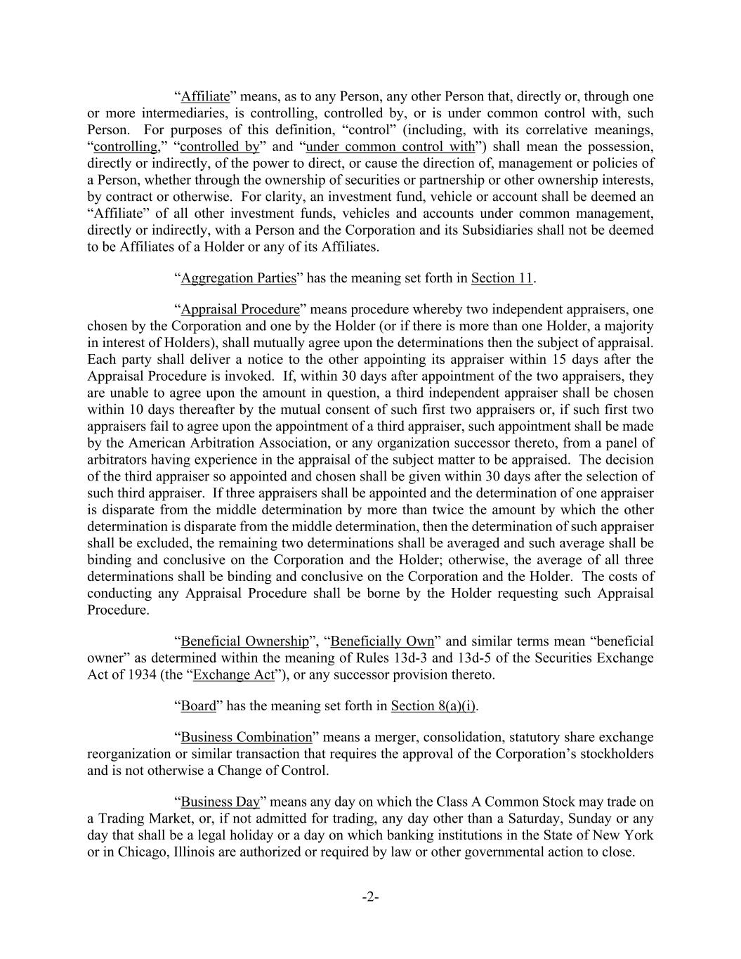 -2- “Affiliate” means, as to any Person, any other Person that, directly or, through one or more intermediaries, is controlling, controlled by, or is under common control with, such Person. For purposes of this definition, “control” (including, with its correlative meanings, “controlling,” “controlled by” and “under common control with”) shall mean the possession, directly or indirectly, of the power to direct, or cause the direction of, management or policies of a Person, whether through the ownership of securities or partnership or other ownership interests, by contract or otherwise. For clarity, an investment fund, vehicle or account shall be deemed an “Affiliate” of all other investment funds, vehicles and accounts under common management, directly or indirectly, with a Person and the Corporation and its Subsidiaries shall not be deemed to be Affiliates of a Holder or any of its Affiliates. “Aggregation Parties” has the meaning set forth in Section 11. “Appraisal Procedure” means procedure whereby two independent appraisers, one chosen by the Corporation and one by the Holder (or if there is more than one Holder, a majority in interest of Holders), shall mutually agree upon the determinations then the subject of appraisal. Each party shall deliver a notice to the other appointing its appraiser within 15 days after the Appraisal Procedure is invoked. If, within 30 days after appointment of the two appraisers, they are unable to agree upon the amount in question, a third independent appraiser shall be chosen within 10 days thereafter by the mutual consent of such first two appraisers or, if such first two appraisers fail to agree upon the appointment of a third appraiser, such appointment shall be made by the American Arbitration Association, or any organization successor thereto, from a panel of arbitrators having experience in the appraisal of the subject matter to be appraised. The decision of the third appraiser so appointed and chosen shall be given within 30 days after the selection of such third appraiser. If three appraisers shall be appointed and the determination of one appraiser is disparate from the middle determination by more than twice the amount by which the other determination is disparate from the middle determination, then the determination of such appraiser shall be excluded, the remaining two determinations shall be averaged and such average shall be binding and conclusive on the Corporation and the Holder; otherwise, the average of all three determinations shall be binding and conclusive on the Corporation and the Holder. The costs of conducting any Appraisal Procedure shall be borne by the Holder requesting such Appraisal Procedure. “Beneficial Ownership”, “Beneficially Own” and similar terms mean “beneficial owner” as determined within the meaning of Rules 13d-3 and 13d-5 of the Securities Exchange Act of 1934 (the “Exchange Act”), or any successor provision thereto. “Board” has the meaning set forth in Section 8(a)(i). “Business Combination” means a merger, consolidation, statutory share exchange reorganization or similar transaction that requires the approval of the Corporation’s stockholders and is not otherwise a Change of Control. “Business Day” means any day on which the Class A Common Stock may trade on a Trading Market, or, if not admitted for trading, any day other than a Saturday, Sunday or any day that shall be a legal holiday or a day on which banking institutions in the State of New York or in Chicago, Illinois are authorized or required by law or other governmental action to close.