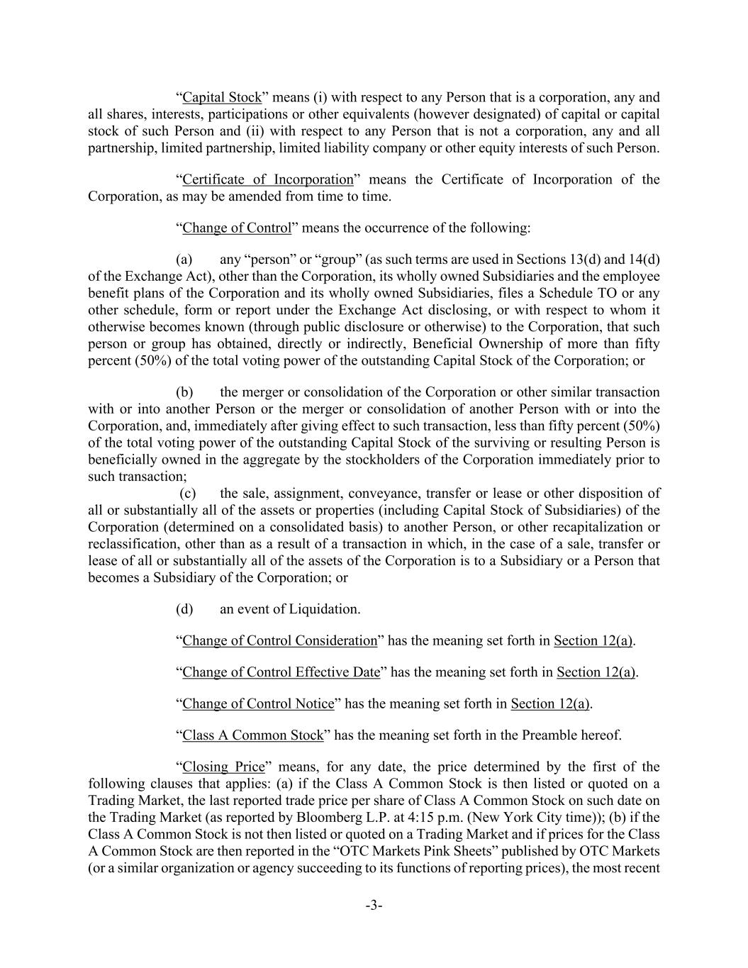 -3- “Capital Stock” means (i) with respect to any Person that is a corporation, any and all shares, interests, participations or other equivalents (however designated) of capital or capital stock of such Person and (ii) with respect to any Person that is not a corporation, any and all partnership, limited partnership, limited liability company or other equity interests of such Person. “Certificate of Incorporation” means the Certificate of Incorporation of the Corporation, as may be amended from time to time. “Change of Control” means the occurrence of the following: (a) any “person” or “group” (as such terms are used in Sections 13(d) and 14(d) of the Exchange Act), other than the Corporation, its wholly owned Subsidiaries and the employee benefit plans of the Corporation and its wholly owned Subsidiaries, files a Schedule TO or any other schedule, form or report under the Exchange Act disclosing, or with respect to whom it otherwise becomes known (through public disclosure or otherwise) to the Corporation, that such person or group has obtained, directly or indirectly, Beneficial Ownership of more than fifty percent (50%) of the total voting power of the outstanding Capital Stock of the Corporation; or (b) the merger or consolidation of the Corporation or other similar transaction with or into another Person or the merger or consolidation of another Person with or into the Corporation, and, immediately after giving effect to such transaction, less than fifty percent (50%) of the total voting power of the outstanding Capital Stock of the surviving or resulting Person is beneficially owned in the aggregate by the stockholders of the Corporation immediately prior to such transaction; (c) the sale, assignment, conveyance, transfer or lease or other disposition of all or substantially all of the assets or properties (including Capital Stock of Subsidiaries) of the Corporation (determined on a consolidated basis) to another Person, or other recapitalization or reclassification, other than as a result of a transaction in which, in the case of a sale, transfer or lease of all or substantially all of the assets of the Corporation is to a Subsidiary or a Person that becomes a Subsidiary of the Corporation; or (d) an event of Liquidation. “Change of Control Consideration” has the meaning set forth in Section 12(a). “Change of Control Effective Date” has the meaning set forth in Section 12(a). “Change of Control Notice” has the meaning set forth in Section 12(a). “Class A Common Stock” has the meaning set forth in the Preamble hereof. “Closing Price” means, for any date, the price determined by the first of the following clauses that applies: (a) if the Class A Common Stock is then listed or quoted on a Trading Market, the last reported trade price per share of Class A Common Stock on such date on the Trading Market (as reported by Bloomberg L.P. at 4:15 p.m. (New York City time)); (b) if the Class A Common Stock is not then listed or quoted on a Trading Market and if prices for the Class A Common Stock are then reported in the “OTC Markets Pink Sheets” published by OTC Markets (or a similar organization or agency succeeding to its functions of reporting prices), the most recent