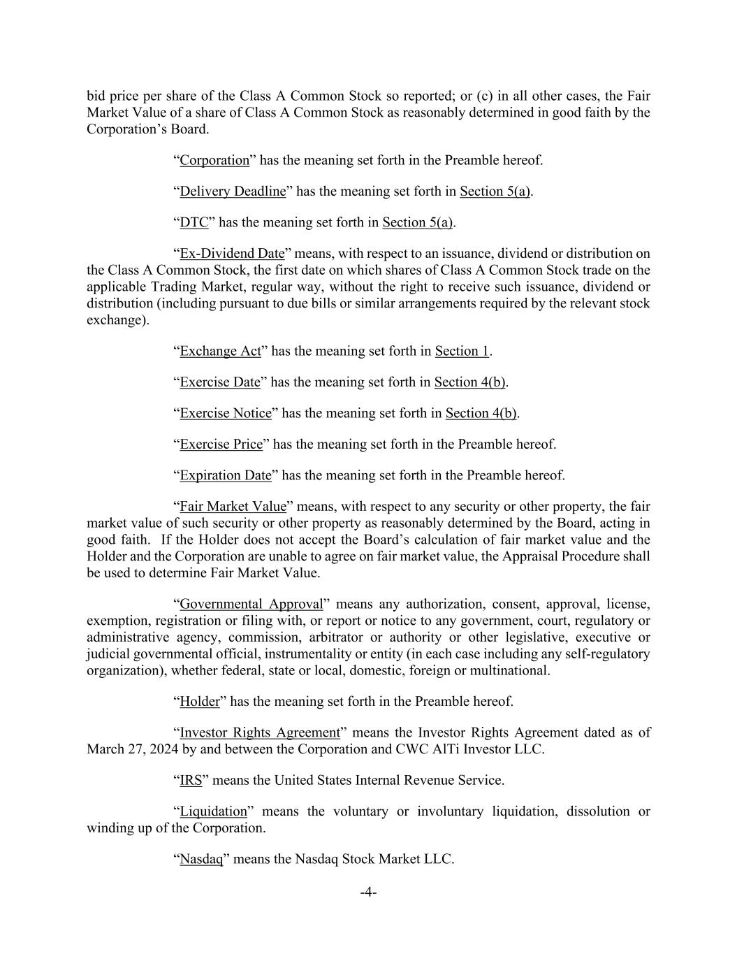 -4- bid price per share of the Class A Common Stock so reported; or (c) in all other cases, the Fair Market Value of a share of Class A Common Stock as reasonably determined in good faith by the Corporation’s Board. “Corporation” has the meaning set forth in the Preamble hereof. “Delivery Deadline” has the meaning set forth in Section 5(a). “DTC” has the meaning set forth in Section 5(a). “Ex-Dividend Date” means, with respect to an issuance, dividend or distribution on the Class A Common Stock, the first date on which shares of Class A Common Stock trade on the applicable Trading Market, regular way, without the right to receive such issuance, dividend or distribution (including pursuant to due bills or similar arrangements required by the relevant stock exchange). “Exchange Act” has the meaning set forth in Section 1. “Exercise Date” has the meaning set forth in Section 4(b). “Exercise Notice” has the meaning set forth in Section 4(b). “Exercise Price” has the meaning set forth in the Preamble hereof. “Expiration Date” has the meaning set forth in the Preamble hereof. “Fair Market Value” means, with respect to any security or other property, the fair market value of such security or other property as reasonably determined by the Board, acting in good faith. If the Holder does not accept the Board’s calculation of fair market value and the Holder and the Corporation are unable to agree on fair market value, the Appraisal Procedure shall be used to determine Fair Market Value. “Governmental Approval” means any authorization, consent, approval, license, exemption, registration or filing with, or report or notice to any government, court, regulatory or administrative agency, commission, arbitrator or authority or other legislative, executive or judicial governmental official, instrumentality or entity (in each case including any self-regulatory organization), whether federal, state or local, domestic, foreign or multinational. “Holder” has the meaning set forth in the Preamble hereof. “Investor Rights Agreement” means the Investor Rights Agreement dated as of March 27, 2024 by and between the Corporation and CWC AlTi Investor LLC. “IRS” means the United States Internal Revenue Service. “Liquidation” means the voluntary or involuntary liquidation, dissolution or winding up of the Corporation. “Nasdaq” means the Nasdaq Stock Market LLC.