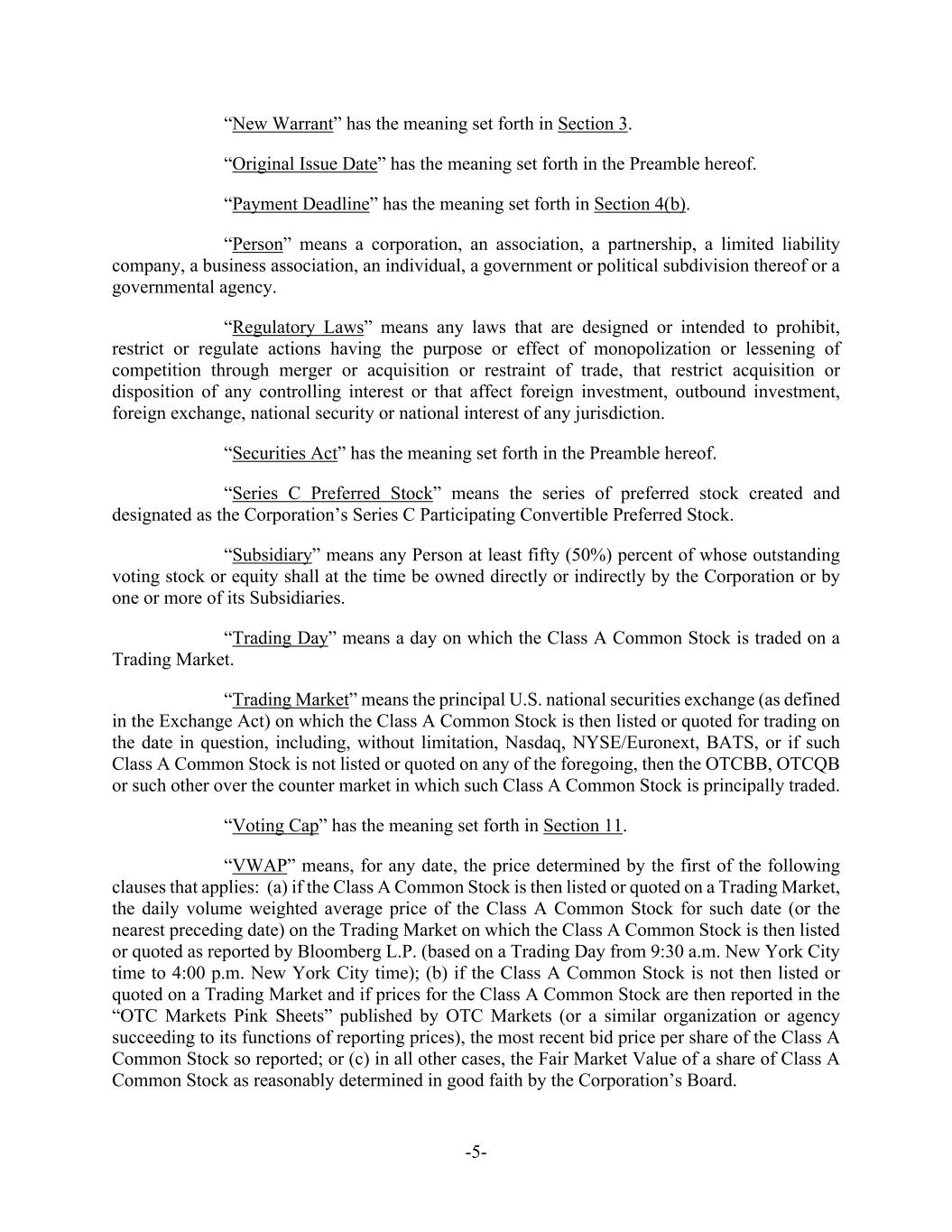 -5- “New Warrant” has the meaning set forth in Section 3. “Original Issue Date” has the meaning set forth in the Preamble hereof. “Payment Deadline” has the meaning set forth in Section 4(b). “Person” means a corporation, an association, a partnership, a limited liability company, a business association, an individual, a government or political subdivision thereof or a governmental agency. “Regulatory Laws” means any laws that are designed or intended to prohibit, restrict or regulate actions having the purpose or effect of monopolization or lessening of competition through merger or acquisition or restraint of trade, that restrict acquisition or disposition of any controlling interest or that affect foreign investment, outbound investment, foreign exchange, national security or national interest of any jurisdiction. “Securities Act” has the meaning set forth in the Preamble hereof. “Series C Preferred Stock” means the series of preferred stock created and designated as the Corporation’s Series C Participating Convertible Preferred Stock. “Subsidiary” means any Person at least fifty (50%) percent of whose outstanding voting stock or equity shall at the time be owned directly or indirectly by the Corporation or by one or more of its Subsidiaries. “Trading Day” means a day on which the Class A Common Stock is traded on a Trading Market. “Trading Market” means the principal U.S. national securities exchange (as defined in the Exchange Act) on which the Class A Common Stock is then listed or quoted for trading on the date in question, including, without limitation, Nasdaq, NYSE/Euronext, BATS, or if such Class A Common Stock is not listed or quoted on any of the foregoing, then the OTCBB, OTCQB or such other over the counter market in which such Class A Common Stock is principally traded. “Voting Cap” has the meaning set forth in Section 11. “VWAP” means, for any date, the price determined by the first of the following clauses that applies: (a) if the Class A Common Stock is then listed or quoted on a Trading Market, the daily volume weighted average price of the Class A Common Stock for such date (or the nearest preceding date) on the Trading Market on which the Class A Common Stock is then listed or quoted as reported by Bloomberg L.P. (based on a Trading Day from 9:30 a.m. New York City time to 4:00 p.m. New York City time); (b) if the Class A Common Stock is not then listed or quoted on a Trading Market and if prices for the Class A Common Stock are then reported in the “OTC Markets Pink Sheets” published by OTC Markets (or a similar organization or agency succeeding to its functions of reporting prices), the most recent bid price per share of the Class A Common Stock so reported; or (c) in all other cases, the Fair Market Value of a share of Class A Common Stock as reasonably determined in good faith by the Corporation’s Board.