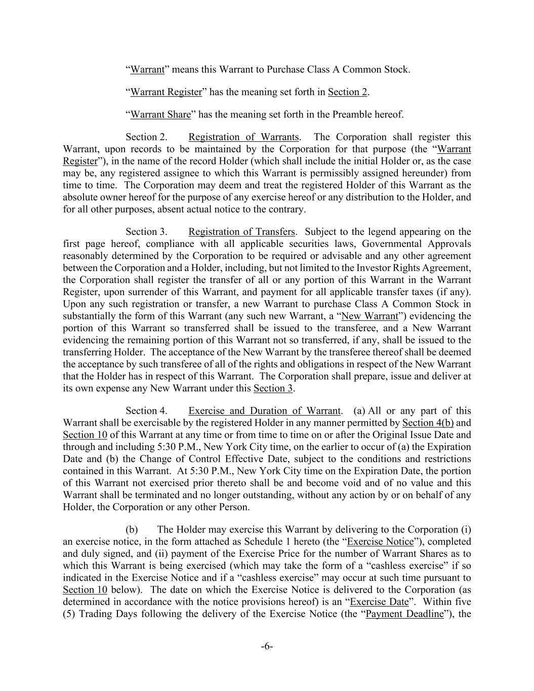 -6- “Warrant” means this Warrant to Purchase Class A Common Stock. “Warrant Register” has the meaning set forth in Section 2. “Warrant Share” has the meaning set forth in the Preamble hereof. Section 2. Registration of Warrants. The Corporation shall register this Warrant, upon records to be maintained by the Corporation for that purpose (the “Warrant Register”), in the name of the record Holder (which shall include the initial Holder or, as the case may be, any registered assignee to which this Warrant is permissibly assigned hereunder) from time to time. The Corporation may deem and treat the registered Holder of this Warrant as the absolute owner hereof for the purpose of any exercise hereof or any distribution to the Holder, and for all other purposes, absent actual notice to the contrary. Section 3. Registration of Transfers. Subject to the legend appearing on the first page hereof, compliance with all applicable securities laws, Governmental Approvals reasonably determined by the Corporation to be required or advisable and any other agreement between the Corporation and a Holder, including, but not limited to the Investor Rights Agreement, the Corporation shall register the transfer of all or any portion of this Warrant in the Warrant Register, upon surrender of this Warrant, and payment for all applicable transfer taxes (if any). Upon any such registration or transfer, a new Warrant to purchase Class A Common Stock in substantially the form of this Warrant (any such new Warrant, a “New Warrant”) evidencing the portion of this Warrant so transferred shall be issued to the transferee, and a New Warrant evidencing the remaining portion of this Warrant not so transferred, if any, shall be issued to the transferring Holder. The acceptance of the New Warrant by the transferee thereof shall be deemed the acceptance by such transferee of all of the rights and obligations in respect of the New Warrant that the Holder has in respect of this Warrant. The Corporation shall prepare, issue and deliver at its own expense any New Warrant under this Section 3. Section 4. Exercise and Duration of Warrant. (a) All or any part of this Warrant shall be exercisable by the registered Holder in any manner permitted by Section 4(b) and Section 10 of this Warrant at any time or from time to time on or after the Original Issue Date and through and including 5:30 P.M., New York City time, on the earlier to occur of (a) the Expiration Date and (b) the Change of Control Effective Date, subject to the conditions and restrictions contained in this Warrant. At 5:30 P.M., New York City time on the Expiration Date, the portion of this Warrant not exercised prior thereto shall be and become void and of no value and this Warrant shall be terminated and no longer outstanding, without any action by or on behalf of any Holder, the Corporation or any other Person. (b) The Holder may exercise this Warrant by delivering to the Corporation (i) an exercise notice, in the form attached as Schedule 1 hereto (the “Exercise Notice”), completed and duly signed, and (ii) payment of the Exercise Price for the number of Warrant Shares as to which this Warrant is being exercised (which may take the form of a “cashless exercise” if so indicated in the Exercise Notice and if a “cashless exercise” may occur at such time pursuant to Section 10 below). The date on which the Exercise Notice is delivered to the Corporation (as determined in accordance with the notice provisions hereof) is an “Exercise Date”. Within five (5) Trading Days following the delivery of the Exercise Notice (the “Payment Deadline”), the