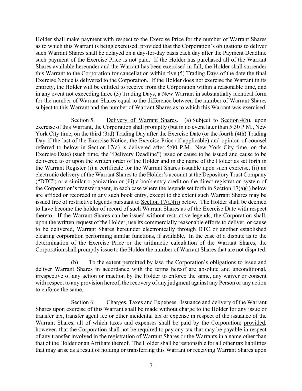 -7- Holder shall make payment with respect to the Exercise Price for the number of Warrant Shares as to which this Warrant is being exercised; provided that the Corporation’s obligations to deliver such Warrant Shares shall be delayed on a day-for-day basis each day after the Payment Deadline such payment of the Exercise Price is not paid. If the Holder has purchased all of the Warrant Shares available hereunder and the Warrant has been exercised in full, the Holder shall surrender this Warrant to the Corporation for cancellation within five (5) Trading Days of the date the final Exercise Notice is delivered to the Corporation. If the Holder does not exercise the Warrant in its entirety, the Holder will be entitled to receive from the Corporation within a reasonable time, and in any event not exceeding three (3) Trading Days, a New Warrant in substantially identical form for the number of Warrant Shares equal to the difference between the number of Warrant Shares subject to this Warrant and the number of Warrant Shares as to which this Warrant was exercised. Section 5. Delivery of Warrant Shares. (a) Subject to Section 4(b), upon exercise of this Warrant, the Corporation shall promptly (but in no event later than 5:30 P.M., New York City time, on the third (3rd) Trading Day after the Exercise Date (or the fourth (4th) Trading Day if the last of the Exercise Notice, the Exercise Price (if applicable) and opinion of counsel referred to below in Section 17(a) is delivered after 5:00 P.M., New York City time, on the Exercise Date) (such time, the “Delivery Deadline”) issue or cause to be issued and cause to be delivered to or upon the written order of the Holder and in the name of the Holder as set forth in the Warrant Register (i) a certificate for the Warrant Shares issuable upon such exercise, (ii) an electronic delivery of the Warrant Shares to the Holder’s account at the Depository Trust Company (“DTC”) or a similar organization or (iii) a book entry credit on the direct registration system of the Corporation’s transfer agent, in each case where the legends set forth in Section 17(a)(i) below are affixed or recorded in any such book entry, except to the extent such Warrant Shares may be issued free of restrictive legends pursuant to Section 17(a)(ii) below. The Holder shall be deemed to have become the holder of record of such Warrant Shares as of the Exercise Date with respect thereto. If the Warrant Shares can be issued without restrictive legends, the Corporation shall, upon the written request of the Holder, use its commercially reasonable efforts to deliver, or cause to be delivered, Warrant Shares hereunder electronically through DTC or another established clearing corporation performing similar functions, if available. In the case of a dispute as to the determination of the Exercise Price or the arithmetic calculation of the Warrant Shares, the Corporation shall promptly issue to the Holder the number of Warrant Shares that are not disputed. (b) To the extent permitted by law, the Corporation’s obligations to issue and deliver Warrant Shares in accordance with the terms hereof are absolute and unconditional, irrespective of any action or inaction by the Holder to enforce the same, any waiver or consent with respect to any provision hereof, the recovery of any judgment against any Person or any action to enforce the same. Section 6. Charges, Taxes and Expenses. Issuance and delivery of the Warrant Shares upon exercise of this Warrant shall be made without charge to the Holder for any issue or transfer tax, transfer agent fee or other incidental tax or expense in respect of the issuance of the Warrant Shares, all of which taxes and expenses shall be paid by the Corporation; provided, however, that the Corporation shall not be required to pay any tax that may be payable in respect of any transfer involved in the registration of Warrant Shares or the Warrants in a name other than that of the Holder or an Affiliate thereof. The Holder shall be responsible for all other tax liabilities that may arise as a result of holding or transferring this Warrant or receiving Warrant Shares upon