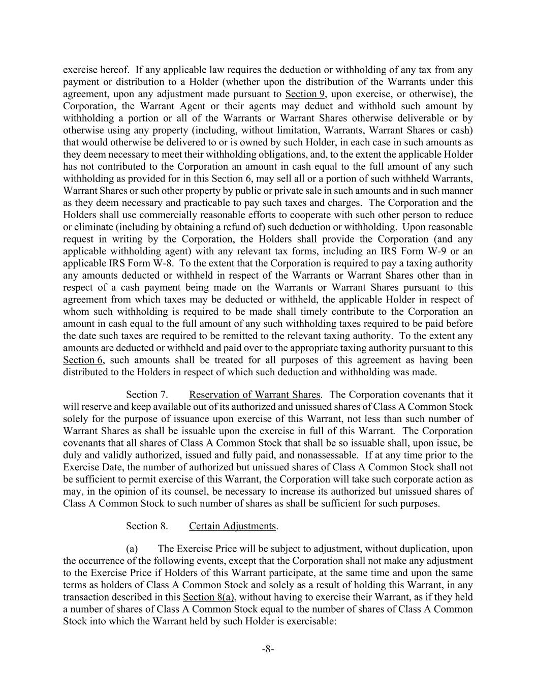 -8- exercise hereof. If any applicable law requires the deduction or withholding of any tax from any payment or distribution to a Holder (whether upon the distribution of the Warrants under this agreement, upon any adjustment made pursuant to Section 9, upon exercise, or otherwise), the Corporation, the Warrant Agent or their agents may deduct and withhold such amount by withholding a portion or all of the Warrants or Warrant Shares otherwise deliverable or by otherwise using any property (including, without limitation, Warrants, Warrant Shares or cash) that would otherwise be delivered to or is owned by such Holder, in each case in such amounts as they deem necessary to meet their withholding obligations, and, to the extent the applicable Holder has not contributed to the Corporation an amount in cash equal to the full amount of any such withholding as provided for in this Section 6, may sell all or a portion of such withheld Warrants, Warrant Shares or such other property by public or private sale in such amounts and in such manner as they deem necessary and practicable to pay such taxes and charges. The Corporation and the Holders shall use commercially reasonable efforts to cooperate with such other person to reduce or eliminate (including by obtaining a refund of) such deduction or withholding. Upon reasonable request in writing by the Corporation, the Holders shall provide the Corporation (and any applicable withholding agent) with any relevant tax forms, including an IRS Form W-9 or an applicable IRS Form W-8. To the extent that the Corporation is required to pay a taxing authority any amounts deducted or withheld in respect of the Warrants or Warrant Shares other than in respect of a cash payment being made on the Warrants or Warrant Shares pursuant to this agreement from which taxes may be deducted or withheld, the applicable Holder in respect of whom such withholding is required to be made shall timely contribute to the Corporation an amount in cash equal to the full amount of any such withholding taxes required to be paid before the date such taxes are required to be remitted to the relevant taxing authority. To the extent any amounts are deducted or withheld and paid over to the appropriate taxing authority pursuant to this Section 6, such amounts shall be treated for all purposes of this agreement as having been distributed to the Holders in respect of which such deduction and withholding was made. Section 7. Reservation of Warrant Shares. The Corporation covenants that it will reserve and keep available out of its authorized and unissued shares of Class A Common Stock solely for the purpose of issuance upon exercise of this Warrant, not less than such number of Warrant Shares as shall be issuable upon the exercise in full of this Warrant. The Corporation covenants that all shares of Class A Common Stock that shall be so issuable shall, upon issue, be duly and validly authorized, issued and fully paid, and nonassessable. If at any time prior to the Exercise Date, the number of authorized but unissued shares of Class A Common Stock shall not be sufficient to permit exercise of this Warrant, the Corporation will take such corporate action as may, in the opinion of its counsel, be necessary to increase its authorized but unissued shares of Class A Common Stock to such number of shares as shall be sufficient for such purposes. Section 8. Certain Adjustments. (a) The Exercise Price will be subject to adjustment, without duplication, upon the occurrence of the following events, except that the Corporation shall not make any adjustment to the Exercise Price if Holders of this Warrant participate, at the same time and upon the same terms as holders of Class A Common Stock and solely as a result of holding this Warrant, in any transaction described in this Section 8(a), without having to exercise their Warrant, as if they held a number of shares of Class A Common Stock equal to the number of shares of Class A Common Stock into which the Warrant held by such Holder is exercisable: