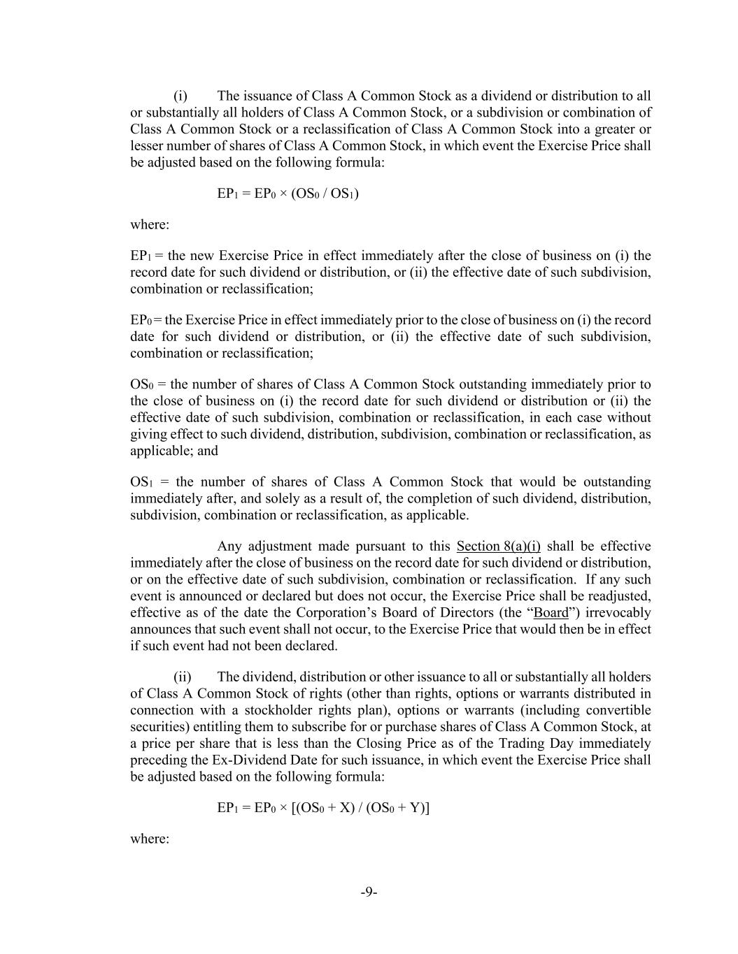 -9- (i) The issuance of Class A Common Stock as a dividend or distribution to all or substantially all holders of Class A Common Stock, or a subdivision or combination of Class A Common Stock or a reclassification of Class A Common Stock into a greater or lesser number of shares of Class A Common Stock, in which event the Exercise Price shall be adjusted based on the following formula: EP1 = EP0 × (OS0 / OS1) where: EP1 = the new Exercise Price in effect immediately after the close of business on (i) the record date for such dividend or distribution, or (ii) the effective date of such subdivision, combination or reclassification; EP0 = the Exercise Price in effect immediately prior to the close of business on (i) the record date for such dividend or distribution, or (ii) the effective date of such subdivision, combination or reclassification; OS0 = the number of shares of Class A Common Stock outstanding immediately prior to the close of business on (i) the record date for such dividend or distribution or (ii) the effective date of such subdivision, combination or reclassification, in each case without giving effect to such dividend, distribution, subdivision, combination or reclassification, as applicable; and OS1 = the number of shares of Class A Common Stock that would be outstanding immediately after, and solely as a result of, the completion of such dividend, distribution, subdivision, combination or reclassification, as applicable. Any adjustment made pursuant to this Section 8(a)(i) shall be effective immediately after the close of business on the record date for such dividend or distribution, or on the effective date of such subdivision, combination or reclassification. If any such event is announced or declared but does not occur, the Exercise Price shall be readjusted, effective as of the date the Corporation’s Board of Directors (the “Board”) irrevocably announces that such event shall not occur, to the Exercise Price that would then be in effect if such event had not been declared. (ii) The dividend, distribution or other issuance to all or substantially all holders of Class A Common Stock of rights (other than rights, options or warrants distributed in connection with a stockholder rights plan), options or warrants (including convertible securities) entitling them to subscribe for or purchase shares of Class A Common Stock, at a price per share that is less than the Closing Price as of the Trading Day immediately preceding the Ex-Dividend Date for such issuance, in which event the Exercise Price shall be adjusted based on the following formula: EP1 = EP0 × [(OS0 + X) / (OS0 + Y)] where: