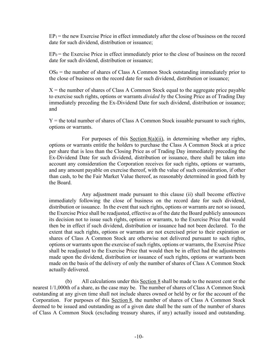 -10- EP1 = the new Exercise Price in effect immediately after the close of business on the record date for such dividend, distribution or issuance; EP0 = the Exercise Price in effect immediately prior to the close of business on the record date for such dividend, distribution or issuance; OS0 = the number of shares of Class A Common Stock outstanding immediately prior to the close of business on the record date for such dividend, distribution or issuance; X = the number of shares of Class A Common Stock equal to the aggregate price payable to exercise such rights, options or warrants divided by the Closing Price as of Trading Day immediately preceding the Ex-Dividend Date for such dividend, distribution or issuance; and Y = the total number of shares of Class A Common Stock issuable pursuant to such rights, options or warrants. For purposes of this Section 8(a)(ii), in determining whether any rights, options or warrants entitle the holders to purchase the Class A Common Stock at a price per share that is less than the Closing Price as of Trading Day immediately preceding the Ex-Dividend Date for such dividend, distribution or issuance, there shall be taken into account any consideration the Corporation receives for such rights, options or warrants, and any amount payable on exercise thereof, with the value of such consideration, if other than cash, to be the Fair Market Value thereof, as reasonably determined in good faith by the Board. Any adjustment made pursuant to this clause (ii) shall become effective immediately following the close of business on the record date for such dividend, distribution or issuance. In the event that such rights, options or warrants are not so issued, the Exercise Price shall be readjusted, effective as of the date the Board publicly announces its decision not to issue such rights, options or warrants, to the Exercise Price that would then be in effect if such dividend, distribution or issuance had not been declared. To the extent that such rights, options or warrants are not exercised prior to their expiration or shares of Class A Common Stock are otherwise not delivered pursuant to such rights, options or warrants upon the exercise of such rights, options or warrants, the Exercise Price shall be readjusted to the Exercise Price that would then be in effect had the adjustments made upon the dividend, distribution or issuance of such rights, options or warrants been made on the basis of the delivery of only the number of shares of Class A Common Stock actually delivered. (b) All calculations under this Section 8 shall be made to the nearest cent or the nearest 1/1,000th of a share, as the case may be. The number of shares of Class A Common Stock outstanding at any given time shall not include shares owned or held by or for the account of the Corporation. For purposes of this Section 8, the number of shares of Class A Common Stock deemed to be issued and outstanding as of a given date shall be the sum of the number of shares of Class A Common Stock (excluding treasury shares, if any) actually issued and outstanding.