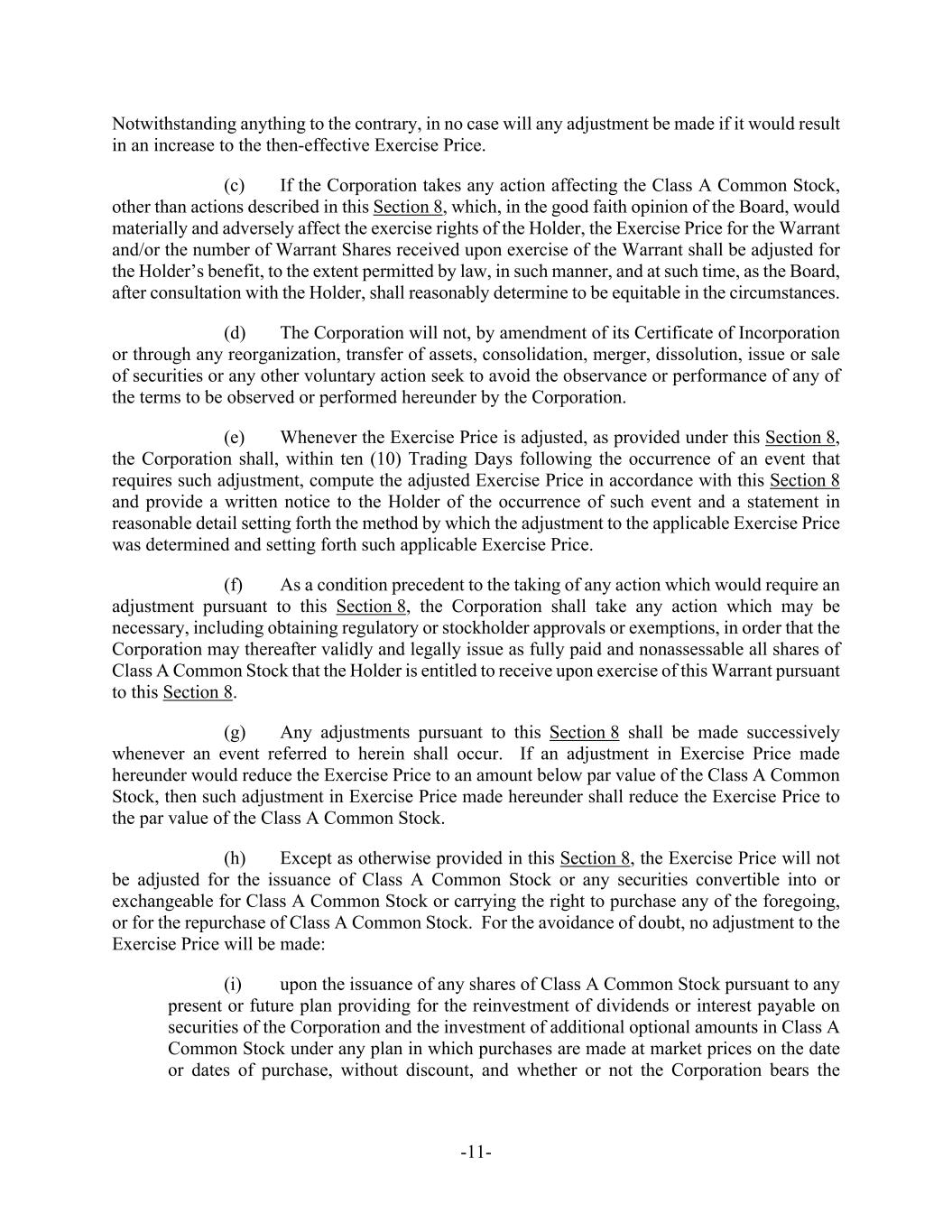 -11- Notwithstanding anything to the contrary, in no case will any adjustment be made if it would result in an increase to the then-effective Exercise Price. (c) If the Corporation takes any action affecting the Class A Common Stock, other than actions described in this Section 8, which, in the good faith opinion of the Board, would materially and adversely affect the exercise rights of the Holder, the Exercise Price for the Warrant and/or the number of Warrant Shares received upon exercise of the Warrant shall be adjusted for the Holder’s benefit, to the extent permitted by law, in such manner, and at such time, as the Board, after consultation with the Holder, shall reasonably determine to be equitable in the circumstances. (d) The Corporation will not, by amendment of its Certificate of Incorporation or through any reorganization, transfer of assets, consolidation, merger, dissolution, issue or sale of securities or any other voluntary action seek to avoid the observance or performance of any of the terms to be observed or performed hereunder by the Corporation. (e) Whenever the Exercise Price is adjusted, as provided under this Section 8, the Corporation shall, within ten (10) Trading Days following the occurrence of an event that requires such adjustment, compute the adjusted Exercise Price in accordance with this Section 8 and provide a written notice to the Holder of the occurrence of such event and a statement in reasonable detail setting forth the method by which the adjustment to the applicable Exercise Price was determined and setting forth such applicable Exercise Price. (f) As a condition precedent to the taking of any action which would require an adjustment pursuant to this Section 8, the Corporation shall take any action which may be necessary, including obtaining regulatory or stockholder approvals or exemptions, in order that the Corporation may thereafter validly and legally issue as fully paid and nonassessable all shares of Class A Common Stock that the Holder is entitled to receive upon exercise of this Warrant pursuant to this Section 8. (g) Any adjustments pursuant to this Section 8 shall be made successively whenever an event referred to herein shall occur. If an adjustment in Exercise Price made hereunder would reduce the Exercise Price to an amount below par value of the Class A Common Stock, then such adjustment in Exercise Price made hereunder shall reduce the Exercise Price to the par value of the Class A Common Stock. (h) Except as otherwise provided in this Section 8, the Exercise Price will not be adjusted for the issuance of Class A Common Stock or any securities convertible into or exchangeable for Class A Common Stock or carrying the right to purchase any of the foregoing, or for the repurchase of Class A Common Stock. For the avoidance of doubt, no adjustment to the Exercise Price will be made: (i) upon the issuance of any shares of Class A Common Stock pursuant to any present or future plan providing for the reinvestment of dividends or interest payable on securities of the Corporation and the investment of additional optional amounts in Class A Common Stock under any plan in which purchases are made at market prices on the date or dates of purchase, without discount, and whether or not the Corporation bears the