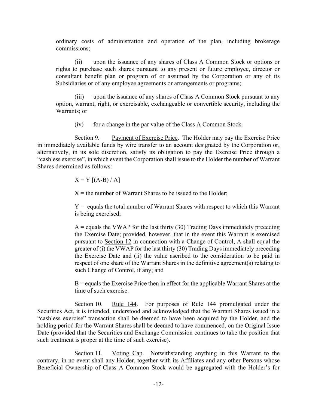 -12- ordinary costs of administration and operation of the plan, including brokerage commissions; (ii) upon the issuance of any shares of Class A Common Stock or options or rights to purchase such shares pursuant to any present or future employee, director or consultant benefit plan or program of or assumed by the Corporation or any of its Subsidiaries or of any employee agreements or arrangements or programs; (iii) upon the issuance of any shares of Class A Common Stock pursuant to any option, warrant, right, or exercisable, exchangeable or convertible security, including the Warrants; or (iv) for a change in the par value of the Class A Common Stock. Section 9. Payment of Exercise Price. The Holder may pay the Exercise Price in immediately available funds by wire transfer to an account designated by the Corporation or, alternatively, in its sole discretion, satisfy its obligation to pay the Exercise Price through a “cashless exercise”, in which event the Corporation shall issue to the Holder the number of Warrant Shares determined as follows: X = Y [(A-B) / A] X = the number of Warrant Shares to be issued to the Holder; Y = equals the total number of Warrant Shares with respect to which this Warrant is being exercised; A = equals the VWAP for the last thirty (30) Trading Days immediately preceding the Exercise Date; provided, however, that in the event this Warrant is exercised pursuant to Section 12 in connection with a Change of Control, A shall equal the greater of (i) the VWAP for the last thirty (30) Trading Days immediately preceding the Exercise Date and (ii) the value ascribed to the consideration to be paid in respect of one share of the Warrant Shares in the definitive agreement(s) relating to such Change of Control, if any; and B = equals the Exercise Price then in effect for the applicable Warrant Shares at the time of such exercise. Section 10. Rule 144. For purposes of Rule 144 promulgated under the Securities Act, it is intended, understood and acknowledged that the Warrant Shares issued in a “cashless exercise” transaction shall be deemed to have been acquired by the Holder, and the holding period for the Warrant Shares shall be deemed to have commenced, on the Original Issue Date (provided that the Securities and Exchange Commission continues to take the position that such treatment is proper at the time of such exercise). Section 11. Voting Cap. Notwithstanding anything in this Warrant to the contrary, in no event shall any Holder, together with its Affiliates and any other Persons whose Beneficial Ownership of Class A Common Stock would be aggregated with the Holder’s for