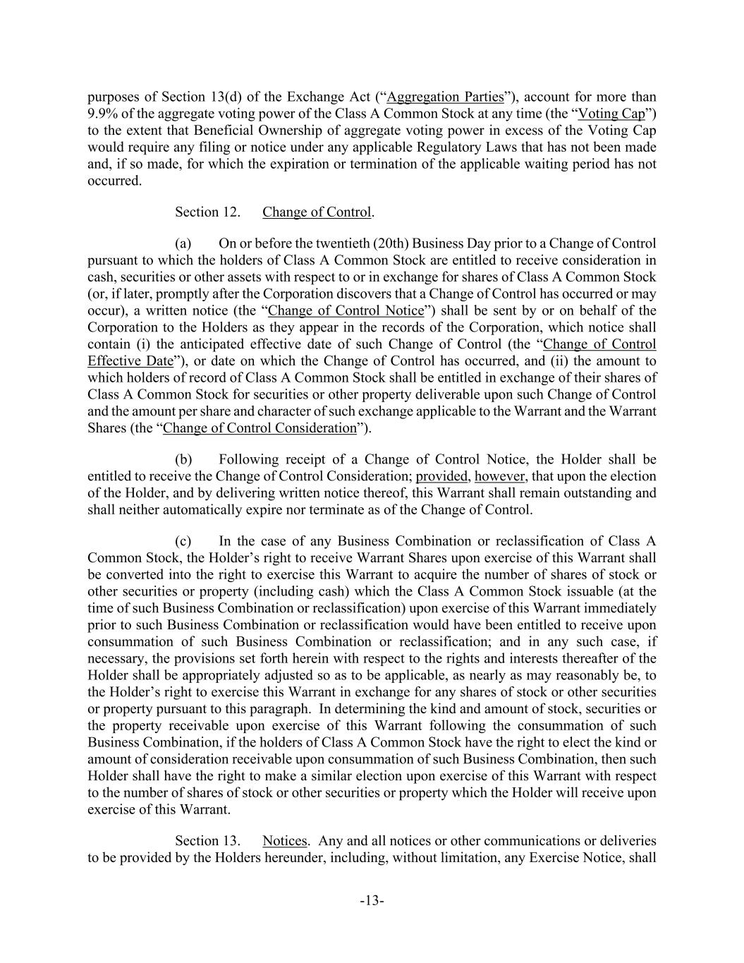 -13- purposes of Section 13(d) of the Exchange Act (“Aggregation Parties”), account for more than 9.9% of the aggregate voting power of the Class A Common Stock at any time (the “Voting Cap”) to the extent that Beneficial Ownership of aggregate voting power in excess of the Voting Cap would require any filing or notice under any applicable Regulatory Laws that has not been made and, if so made, for which the expiration or termination of the applicable waiting period has not occurred. Section 12. Change of Control. (a) On or before the twentieth (20th) Business Day prior to a Change of Control pursuant to which the holders of Class A Common Stock are entitled to receive consideration in cash, securities or other assets with respect to or in exchange for shares of Class A Common Stock (or, if later, promptly after the Corporation discovers that a Change of Control has occurred or may occur), a written notice (the “Change of Control Notice”) shall be sent by or on behalf of the Corporation to the Holders as they appear in the records of the Corporation, which notice shall contain (i) the anticipated effective date of such Change of Control (the “Change of Control Effective Date”), or date on which the Change of Control has occurred, and (ii) the amount to which holders of record of Class A Common Stock shall be entitled in exchange of their shares of Class A Common Stock for securities or other property deliverable upon such Change of Control and the amount per share and character of such exchange applicable to the Warrant and the Warrant Shares (the “Change of Control Consideration”). (b) Following receipt of a Change of Control Notice, the Holder shall be entitled to receive the Change of Control Consideration; provided, however, that upon the election of the Holder, and by delivering written notice thereof, this Warrant shall remain outstanding and shall neither automatically expire nor terminate as of the Change of Control. (c) In the case of any Business Combination or reclassification of Class A Common Stock, the Holder’s right to receive Warrant Shares upon exercise of this Warrant shall be converted into the right to exercise this Warrant to acquire the number of shares of stock or other securities or property (including cash) which the Class A Common Stock issuable (at the time of such Business Combination or reclassification) upon exercise of this Warrant immediately prior to such Business Combination or reclassification would have been entitled to receive upon consummation of such Business Combination or reclassification; and in any such case, if necessary, the provisions set forth herein with respect to the rights and interests thereafter of the Holder shall be appropriately adjusted so as to be applicable, as nearly as may reasonably be, to the Holder’s right to exercise this Warrant in exchange for any shares of stock or other securities or property pursuant to this paragraph. In determining the kind and amount of stock, securities or the property receivable upon exercise of this Warrant following the consummation of such Business Combination, if the holders of Class A Common Stock have the right to elect the kind or amount of consideration receivable upon consummation of such Business Combination, then such Holder shall have the right to make a similar election upon exercise of this Warrant with respect to the number of shares of stock or other securities or property which the Holder will receive upon exercise of this Warrant. Section 13. Notices. Any and all notices or other communications or deliveries to be provided by the Holders hereunder, including, without limitation, any Exercise Notice, shall