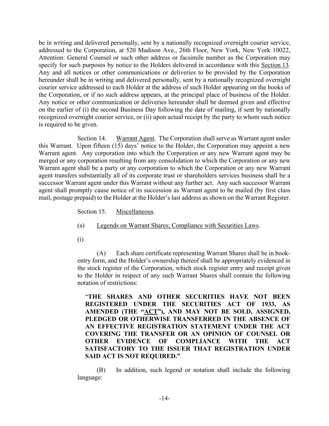 -14- be in writing and delivered personally, sent by a nationally recognized overnight courier service, addressed to the Corporation, at 520 Madison Ave., 26th Floor, New York, New York 10022, Attention: General Counsel or such other address or facsimile number as the Corporation may specify for such purposes by notice to the Holders delivered in accordance with this Section 13. Any and all notices or other communications or deliveries to be provided by the Corporation hereunder shall be in writing and delivered personally, sent by a nationally recognized overnight courier service addressed to each Holder at the address of such Holder appearing on the books of the Corporation, or if no such address appears, at the principal place of business of the Holder. Any notice or other communication or deliveries hereunder shall be deemed given and effective on the earlier of (i) the second Business Day following the date of mailing, if sent by nationally recognized overnight courier service, or (ii) upon actual receipt by the party to whom such notice is required to be given. Section 14. Warrant Agent. The Corporation shall serve as Warrant agent under this Warrant. Upon fifteen (15) days’ notice to the Holder, the Corporation may appoint a new Warrant agent. Any corporation into which the Corporation or any new Warrant agent may be merged or any corporation resulting from any consolidation to which the Corporation or any new Warrant agent shall be a party or any corporation to which the Corporation or any new Warrant agent transfers substantially all of its corporate trust or shareholders services business shall be a successor Warrant agent under this Warrant without any further act. Any such successor Warrant agent shall promptly cause notice of its succession as Warrant agent to be mailed (by first class mail, postage prepaid) to the Holder at the Holder’s last address as shown on the Warrant Register. Section 15. Miscellaneous. (a) Legends on Warrant Shares; Compliance with Securities Laws. (i) (A) Each share certificate representing Warrant Shares shall be in book- entry form, and the Holder’s ownership thereof shall be appropriately evidenced in the stock register of the Corporation, which stock register entry and receipt given to the Holder in respect of any such Warrant Shares shall contain the following notation of restrictions: “THE SHARES AND OTHER SECURITIES HAVE NOT BEEN REGISTERED UNDER THE SECURITIES ACT OF 1933, AS AMENDED (THE “ACT”), AND MAY NOT BE SOLD, ASSIGNED, PLEDGED OR OTHERWISE TRANSFERRED IN THE ABSENCE OF AN EFFECTIVE REGISTRATION STATEMENT UNDER THE ACT COVERING THE TRANSFER OR AN OPINION OF COUNSEL OR OTHER EVIDENCE OF COMPLIANCE WITH THE ACT SATISFACTORY TO THE ISSUER THAT REGISTRATION UNDER SAID ACT IS NOT REQUIRED.” (B) In addition, such legend or notation shall include the following language: