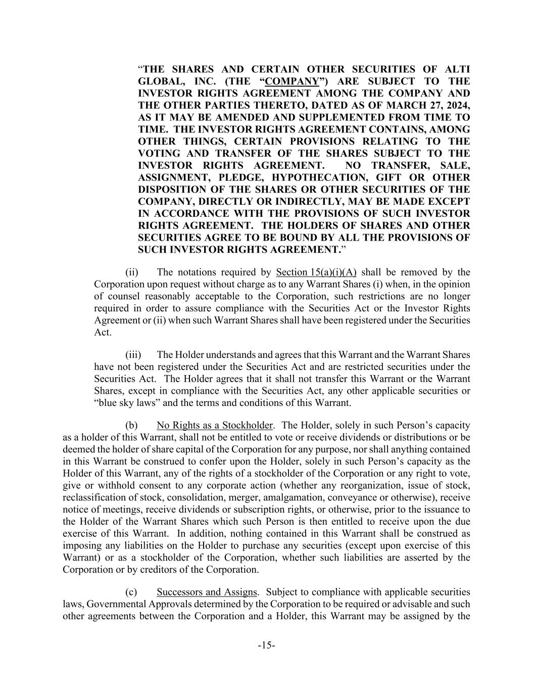 -15- “THE SHARES AND CERTAIN OTHER SECURITIES OF ALTI GLOBAL, INC. (THE “COMPANY”) ARE SUBJECT TO THE INVESTOR RIGHTS AGREEMENT AMONG THE COMPANY AND THE OTHER PARTIES THERETO, DATED AS OF MARCH 27, 2024, AS IT MAY BE AMENDED AND SUPPLEMENTED FROM TIME TO TIME. THE INVESTOR RIGHTS AGREEMENT CONTAINS, AMONG OTHER THINGS, CERTAIN PROVISIONS RELATING TO THE VOTING AND TRANSFER OF THE SHARES SUBJECT TO THE INVESTOR RIGHTS AGREEMENT. NO TRANSFER, SALE, ASSIGNMENT, PLEDGE, HYPOTHECATION, GIFT OR OTHER DISPOSITION OF THE SHARES OR OTHER SECURITIES OF THE COMPANY, DIRECTLY OR INDIRECTLY, MAY BE MADE EXCEPT IN ACCORDANCE WITH THE PROVISIONS OF SUCH INVESTOR RIGHTS AGREEMENT. THE HOLDERS OF SHARES AND OTHER SECURITIES AGREE TO BE BOUND BY ALL THE PROVISIONS OF SUCH INVESTOR RIGHTS AGREEMENT.” (ii) The notations required by Section 15(a)(i)(A) shall be removed by the Corporation upon request without charge as to any Warrant Shares (i) when, in the opinion of counsel reasonably acceptable to the Corporation, such restrictions are no longer required in order to assure compliance with the Securities Act or the Investor Rights Agreement or (ii) when such Warrant Shares shall have been registered under the Securities Act. (iii) The Holder understands and agrees that this Warrant and the Warrant Shares have not been registered under the Securities Act and are restricted securities under the Securities Act. The Holder agrees that it shall not transfer this Warrant or the Warrant Shares, except in compliance with the Securities Act, any other applicable securities or “blue sky laws” and the terms and conditions of this Warrant. (b) No Rights as a Stockholder. The Holder, solely in such Person’s capacity as a holder of this Warrant, shall not be entitled to vote or receive dividends or distributions or be deemed the holder of share capital of the Corporation for any purpose, nor shall anything contained in this Warrant be construed to confer upon the Holder, solely in such Person’s capacity as the Holder of this Warrant, any of the rights of a stockholder of the Corporation or any right to vote, give or withhold consent to any corporate action (whether any reorganization, issue of stock, reclassification of stock, consolidation, merger, amalgamation, conveyance or otherwise), receive notice of meetings, receive dividends or subscription rights, or otherwise, prior to the issuance to the Holder of the Warrant Shares which such Person is then entitled to receive upon the due exercise of this Warrant. In addition, nothing contained in this Warrant shall be construed as imposing any liabilities on the Holder to purchase any securities (except upon exercise of this Warrant) or as a stockholder of the Corporation, whether such liabilities are asserted by the Corporation or by creditors of the Corporation. (c) Successors and Assigns. Subject to compliance with applicable securities laws, Governmental Approvals determined by the Corporation to be required or advisable and such other agreements between the Corporation and a Holder, this Warrant may be assigned by the