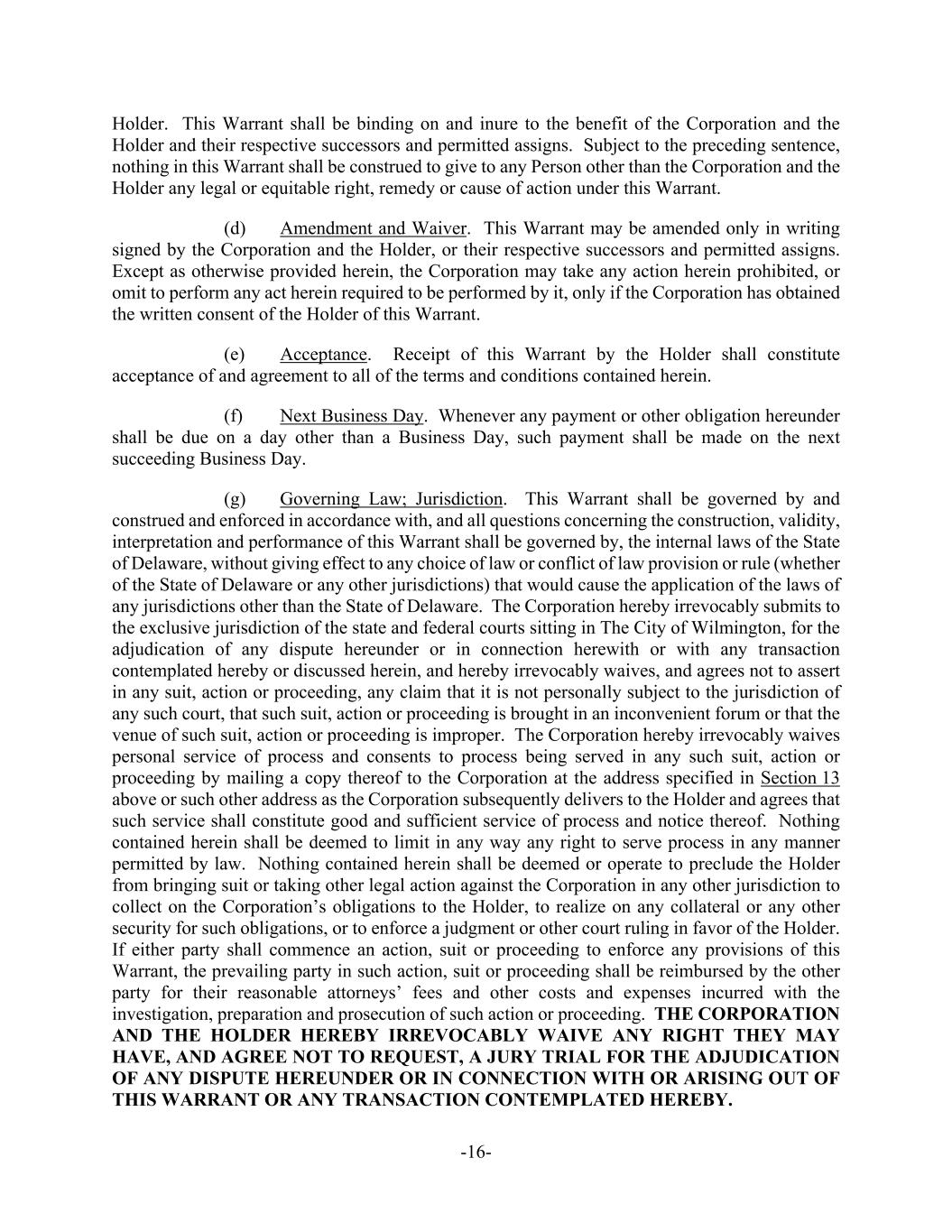 -16- Holder. This Warrant shall be binding on and inure to the benefit of the Corporation and the Holder and their respective successors and permitted assigns. Subject to the preceding sentence, nothing in this Warrant shall be construed to give to any Person other than the Corporation and the Holder any legal or equitable right, remedy or cause of action under this Warrant. (d) Amendment and Waiver. This Warrant may be amended only in writing signed by the Corporation and the Holder, or their respective successors and permitted assigns. Except as otherwise provided herein, the Corporation may take any action herein prohibited, or omit to perform any act herein required to be performed by it, only if the Corporation has obtained the written consent of the Holder of this Warrant. (e) Acceptance. Receipt of this Warrant by the Holder shall constitute acceptance of and agreement to all of the terms and conditions contained herein. (f) Next Business Day. Whenever any payment or other obligation hereunder shall be due on a day other than a Business Day, such payment shall be made on the next succeeding Business Day. (g) Governing Law; Jurisdiction. This Warrant shall be governed by and construed and enforced in accordance with, and all questions concerning the construction, validity, interpretation and performance of this Warrant shall be governed by, the internal laws of the State of Delaware, without giving effect to any choice of law or conflict of law provision or rule (whether of the State of Delaware or any other jurisdictions) that would cause the application of the laws of any jurisdictions other than the State of Delaware. The Corporation hereby irrevocably submits to the exclusive jurisdiction of the state and federal courts sitting in The City of Wilmington, for the adjudication of any dispute hereunder or in connection herewith or with any transaction contemplated hereby or discussed herein, and hereby irrevocably waives, and agrees not to assert in any suit, action or proceeding, any claim that it is not personally subject to the jurisdiction of any such court, that such suit, action or proceeding is brought in an inconvenient forum or that the venue of such suit, action or proceeding is improper. The Corporation hereby irrevocably waives personal service of process and consents to process being served in any such suit, action or proceeding by mailing a copy thereof to the Corporation at the address specified in Section 13 above or such other address as the Corporation subsequently delivers to the Holder and agrees that such service shall constitute good and sufficient service of process and notice thereof. Nothing contained herein shall be deemed to limit in any way any right to serve process in any manner permitted by law. Nothing contained herein shall be deemed or operate to preclude the Holder from bringing suit or taking other legal action against the Corporation in any other jurisdiction to collect on the Corporation’s obligations to the Holder, to realize on any collateral or any other security for such obligations, or to enforce a judgment or other court ruling in favor of the Holder. If either party shall commence an action, suit or proceeding to enforce any provisions of this Warrant, the prevailing party in such action, suit or proceeding shall be reimbursed by the other party for their reasonable attorneys’ fees and other costs and expenses incurred with the investigation, preparation and prosecution of such action or proceeding. THE CORPORATION AND THE HOLDER HEREBY IRREVOCABLY WAIVE ANY RIGHT THEY MAY HAVE, AND AGREE NOT TO REQUEST, A JURY TRIAL FOR THE ADJUDICATION OF ANY DISPUTE HEREUNDER OR IN CONNECTION WITH OR ARISING OUT OF THIS WARRANT OR ANY TRANSACTION CONTEMPLATED HEREBY.