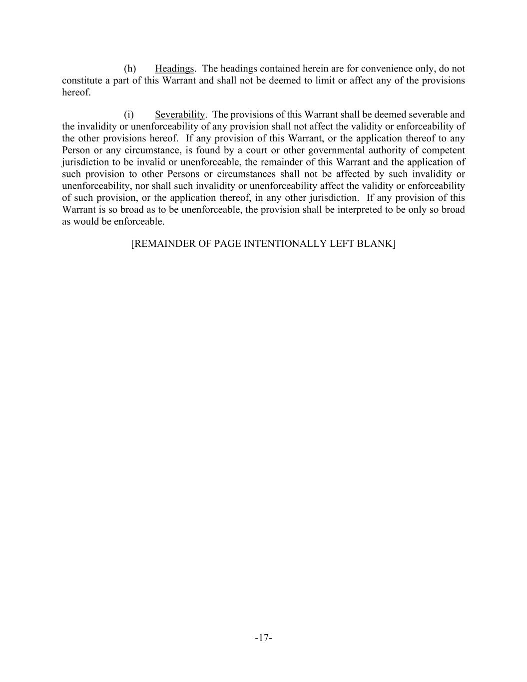 -17- (h) Headings. The headings contained herein are for convenience only, do not constitute a part of this Warrant and shall not be deemed to limit or affect any of the provisions hereof. (i) Severability. The provisions of this Warrant shall be deemed severable and the invalidity or unenforceability of any provision shall not affect the validity or enforceability of the other provisions hereof. If any provision of this Warrant, or the application thereof to any Person or any circumstance, is found by a court or other governmental authority of competent jurisdiction to be invalid or unenforceable, the remainder of this Warrant and the application of such provision to other Persons or circumstances shall not be affected by such invalidity or unenforceability, nor shall such invalidity or unenforceability affect the validity or enforceability of such provision, or the application thereof, in any other jurisdiction. If any provision of this Warrant is so broad as to be unenforceable, the provision shall be interpreted to be only so broad as would be enforceable. [REMAINDER OF PAGE INTENTIONALLY LEFT BLANK]