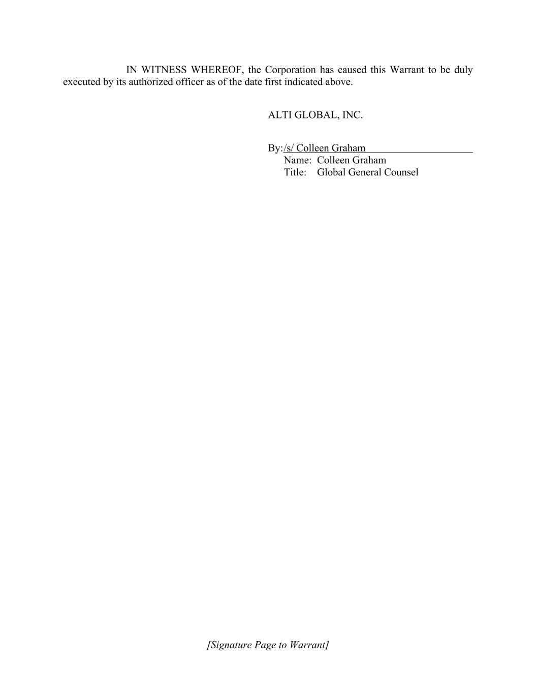 [Signature Page to Warrant] IN WITNESS WHEREOF, the Corporation has caused this Warrant to be duly executed by its authorized officer as of the date first indicated above. ALTI GLOBAL, INC. By: /s/ Colleen Graham Name: Colleen Graham Title: Global General Counsel