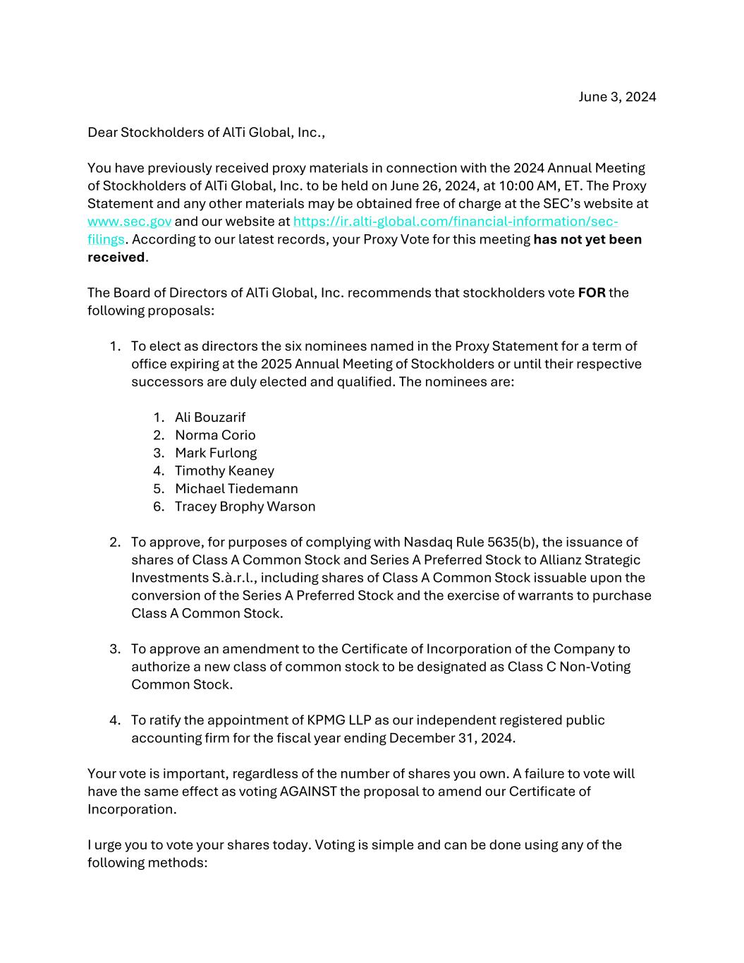 June 3, 2024 Dear Stockholders of AlTi Global, Inc., You have previously received proxy materials in connection with the 2024 Annual Meeting of Stockholders of AlTi Global, Inc. to be held on June 26, 2024, at 10:00 AM, ET. The Proxy Statement and any other materials may be obtained free of charge at the SEC’s website at www.sec.gov and our website at https://ir.alti-global.com/financial-information/sec- filings. According to our latest records, your Proxy Vote for this meeting has not yet been received. The Board of Directors of AlTi Global, Inc. recommends that stockholders vote FOR the following proposals: 1. To elect as directors the six nominees named in the Proxy Statement for a term of office expiring at the 2025 Annual Meeting of Stockholders or until their respective successors are duly elected and qualified. The nominees are: 1. Ali Bouzarif 2. Norma Corio 3. Mark Furlong 4. Timothy Keaney 5. Michael Tiedemann 6. Tracey Brophy Warson 2. To approve, for purposes of complying with Nasdaq Rule 5635(b), the issuance of shares of Class A Common Stock and Series A Preferred Stock to Allianz Strategic Investments S.à.r.l., including shares of Class A Common Stock issuable upon the conversion of the Series A Preferred Stock and the exercise of warrants to purchase Class A Common Stock. 3. To approve an amendment to the Certificate of Incorporation of the Company to authorize a new class of common stock to be designated as Class C Non-Voting Common Stock. 4. To ratify the appointment of KPMG LLP as our independent registered public accounting firm for the fiscal year ending December 31, 2024. Your vote is important, regardless of the number of shares you own. A failure to vote will have the same effect as voting AGAINST the proposal to amend our Certificate of Incorporation. I urge you to vote your shares today. Voting is simple and can be done using any of the following methods: