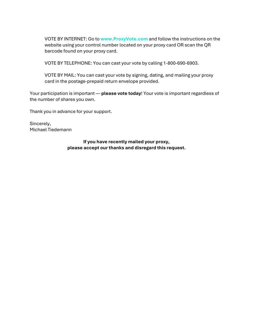 VOTE BY INTERNET: Go to www.ProxyVote.com and follow the instructions on the website using your control number located on your proxy card OR scan the QR barcode found on your proxy card. VOTE BY TELEPHONE: You can cast your vote by calling 1-800-690-6903. VOTE BY MAIL: You can cast your vote by signing, dating, and mailing your proxy card in the postage-prepaid return envelope provided. Your participation is important — please vote today! Your vote is important regardless of the number of shares you own. Thank you in advance for your support. Sincerely, Michael Tiedemann If you have recently mailed your proxy, please accept our thanks and disregard this request.