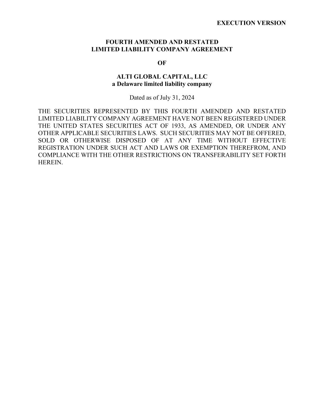 EXECUTION VERSION FOURTH AMENDED AND RESTATED LIMITED LIABILITY COMPANY AGREEMENT OF ALTI GLOBAL CAPITAL, LLC a Delaware limited liability company Dated as of July 31, 2024 THE SECURITIES REPRESENTED BY THIS FOURTH AMENDED AND RESTATED LIMITED LIABILITY COMPANY AGREEMENT HAVE NOT BEEN REGISTERED UNDER THE UNITED STATES SECURITIES ACT OF 1933, AS AMENDED, OR UNDER ANY OTHER APPLICABLE SECURITIES LAWS. SUCH SECURITIES MAY NOT BE OFFERED, SOLD OR OTHERWISE DISPOSED OF AT ANY TIME WITHOUT EFFECTIVE REGISTRATION UNDER SUCH ACT AND LAWS OR EXEMPTION THEREFROM, AND COMPLIANCE WITH THE OTHER RESTRICTIONS ON TRANSFERABILITY SET FORTH HEREIN.