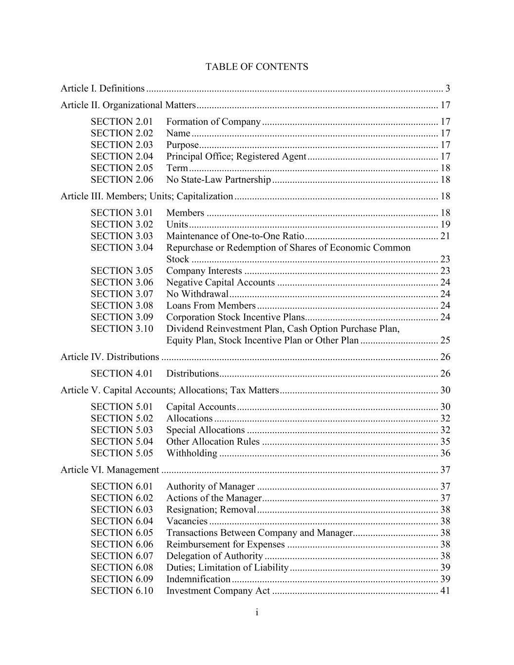 i TABLE OF CONTENTS Article I. Definitions ...................................................................................................................... 3 Article II. Organizational Matters ................................................................................................ 17 SECTION 2.01 Formation of Company ...................................................................... 17 SECTION 2.02 Name .................................................................................................. 17 SECTION 2.03 Purpose ............................................................................................... 17 SECTION 2.04 Principal Office; Registered Agent .................................................... 17 SECTION 2.05 Term ................................................................................................... 18 SECTION 2.06 No State-Law Partnership .................................................................. 18 Article III. Members; Units; Capitalization ................................................................................. 18 SECTION 3.01 Members ............................................................................................ 18 SECTION 3.02 Units ................................................................................................... 19 SECTION 3.03 Maintenance of One-to-One Ratio ..................................................... 21 SECTION 3.04 Repurchase or Redemption of Shares of Economic Common Stock .................................................................................................. 23 SECTION 3.05 Company Interests ............................................................................. 23 SECTION 3.06 Negative Capital Accounts ................................................................ 24 SECTION 3.07 No Withdrawal ................................................................................... 24 SECTION 3.08 Loans From Members ........................................................................ 24 SECTION 3.09 Corporation Stock Incentive Plans..................................................... 24 SECTION 3.10 Dividend Reinvestment Plan, Cash Option Purchase Plan, Equity Plan, Stock Incentive Plan or Other Plan ............................... 25 Article IV. Distributions .............................................................................................................. 26 SECTION 4.01 Distributions ....................................................................................... 26 Article V. Capital Accounts; Allocations; Tax Matters ............................................................... 30 SECTION 5.01 Capital Accounts ................................................................................ 30 SECTION 5.02 Allocations ......................................................................................... 32 SECTION 5.03 Special Allocations ............................................................................ 32 SECTION 5.04 Other Allocation Rules ...................................................................... 35 SECTION 5.05 Withholding ....................................................................................... 36 Article VI. Management .............................................................................................................. 37 SECTION 6.01 Authority of Manager ........................................................................ 37 SECTION 6.02 Actions of the Manager ...................................................................... 37 SECTION 6.03 Resignation; Removal ........................................................................ 38 SECTION 6.04 Vacancies ........................................................................................... 38 SECTION 6.05 Transactions Between Company and Manager.................................. 38 SECTION 6.06 Reimbursement for Expenses ............................................................ 38 SECTION 6.07 Delegation of Authority ..................................................................... 38 SECTION 6.08 Duties; Limitation of Liability ........................................................... 39 SECTION 6.09 Indemnification .................................................................................. 39 SECTION 6.10 Investment Company Act .................................................................. 41