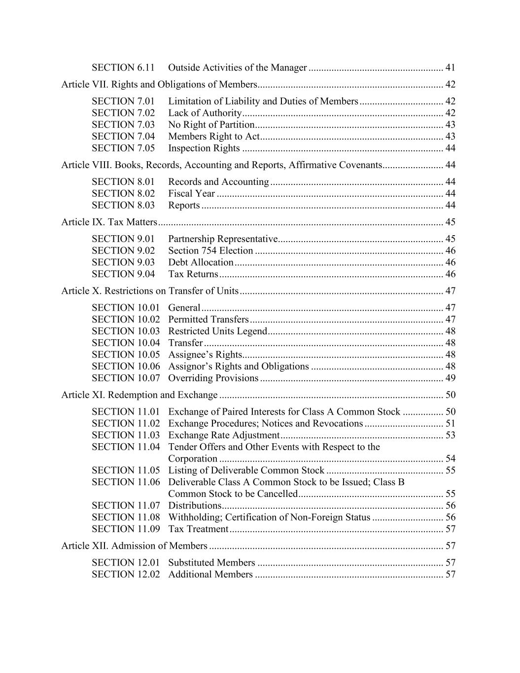 SECTION 6.11 Outside Activities of the Manager ..................................................... 41 Article VII. Rights and Obligations of Members ......................................................................... 42 SECTION 7.01 Limitation of Liability and Duties of Members ................................. 42 SECTION 7.02 Lack of Authority ............................................................................... 42 SECTION 7.03 No Right of Partition .......................................................................... 43 SECTION 7.04 Members Right to Act ........................................................................ 43 SECTION 7.05 Inspection Rights ............................................................................... 44 Article VIII. Books, Records, Accounting and Reports, Affirmative Covenants ........................ 44 SECTION 8.01 Records and Accounting .................................................................... 44 SECTION 8.02 Fiscal Year ......................................................................................... 44 SECTION 8.03 Reports ............................................................................................... 44 Article IX. Tax Matters ................................................................................................................ 45 SECTION 9.01 Partnership Representative ................................................................. 45 SECTION 9.02 Section 754 Election .......................................................................... 46 SECTION 9.03 Debt Allocation .................................................................................. 46 SECTION 9.04 Tax Returns ........................................................................................ 46 Article X. Restrictions on Transfer of Units ................................................................................ 47 SECTION 10.01 General ............................................................................................... 47 SECTION 10.02 Permitted Transfers ............................................................................ 47 SECTION 10.03 Restricted Units Legend ..................................................................... 48 SECTION 10.04 Transfer .............................................................................................. 48 SECTION 10.05 Assignee’s Rights............................................................................... 48 SECTION 10.06 Assignor’s Rights and Obligations .................................................... 48 SECTION 10.07 Overriding Provisions ........................................................................ 49 Article XI. Redemption and Exchange ........................................................................................ 50 SECTION 11.01 Exchange of Paired Interests for Class A Common Stock ................ 50 SECTION 11.02 Exchange Procedures; Notices and Revocations ............................... 51 SECTION 11.03 Exchange Rate Adjustment ................................................................ 53 SECTION 11.04 Tender Offers and Other Events with Respect to the Corporation ........................................................................................ 54 SECTION 11.05 Listing of Deliverable Common Stock .............................................. 55 SECTION 11.06 Deliverable Class A Common Stock to be Issued; Class B Common Stock to be Cancelled ......................................................... 55 SECTION 11.07 Distributions ....................................................................................... 56 SECTION 11.08 Withholding; Certification of Non-Foreign Status ............................ 56 SECTION 11.09 Tax Treatment .................................................................................... 57 Article XII. Admission of Members ............................................................................................ 57 SECTION 12.01 Substituted Members ......................................................................... 57 SECTION 12.02 Additional Members .......................................................................... 57