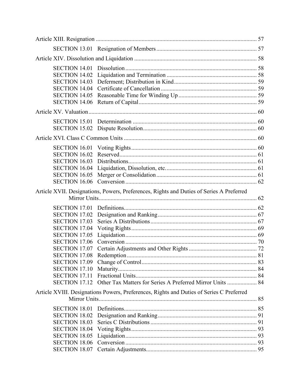 Article XIII. Resignation ............................................................................................................. 57 SECTION 13.01 Resignation of Members .................................................................... 57 Article XIV. Dissolution and Liquidation ................................................................................... 58 SECTION 14.01 Dissolution ......................................................................................... 58 SECTION 14.02 Liquidation and Termination ............................................................. 58 SECTION 14.03 Deferment; Distribution in Kind ........................................................ 59 SECTION 14.04 Certificate of Cancellation ................................................................. 59 SECTION 14.05 Reasonable Time for Winding Up ..................................................... 59 SECTION 14.06 Return of Capital ................................................................................ 59 Article XV. Valuation .................................................................................................................. 60 SECTION 15.01 Determination .................................................................................... 60 SECTION 15.02 Dispute Resolution ............................................................................. 60 Article XVI. Class C Common Units .......................................................................................... 60 SECTION 16.01 Voting Rights ..................................................................................... 60 SECTION 16.02 Reserved ............................................................................................. 61 SECTION 16.03 Distributions ....................................................................................... 61 SECTION 16.04 Liquidation, Dissolution, etc. ............................................................. 61 SECTION 16.05 Merger or Consolidation .................................................................... 61 SECTION 16.06 Conversion ......................................................................................... 62 Article XVII. Designations, Powers, Preferences, Rights and Duties of Series A Preferred Mirror Units ........................................................................................................... 62 SECTION 17.01 Definitions.......................................................................................... 62 SECTION 17.02 Designation and Ranking ................................................................... 67 SECTION 17.03 Series A Distributions ........................................................................ 67 SECTION 17.04 Voting Rights ..................................................................................... 69 SECTION 17.05 Liquidation ......................................................................................... 69 SECTION 17.06 Conversion ......................................................................................... 70 SECTION 17.07 Certain Adjustments and Other Rights .............................................. 72 SECTION 17.08 Redemption ........................................................................................ 81 SECTION 17.09 Change of Control .............................................................................. 83 SECTION 17.10 Maturity.............................................................................................. 84 SECTION 17.11 Fractional Units .................................................................................. 84 SECTION 17.12 Other Tax Matters for Series A Preferred Mirror Units .................... 84 Article XVIII. Designations Powers, Preferences, Rights and Duties of Series C Preferred Mirror Units ........................................................................................................... 85 SECTION 18.01 Definitions.......................................................................................... 85 SECTION 18.02 Designation and Ranking ................................................................... 91 SECTION 18.03 Series C Distributions ........................................................................ 91 SECTION 18.04 Voting Rights ..................................................................................... 93 SECTION 18.05 Liquidation ......................................................................................... 93 SECTION 18.06 Conversion ......................................................................................... 93 SECTION 18.07 Certain Adjustments........................................................................... 95