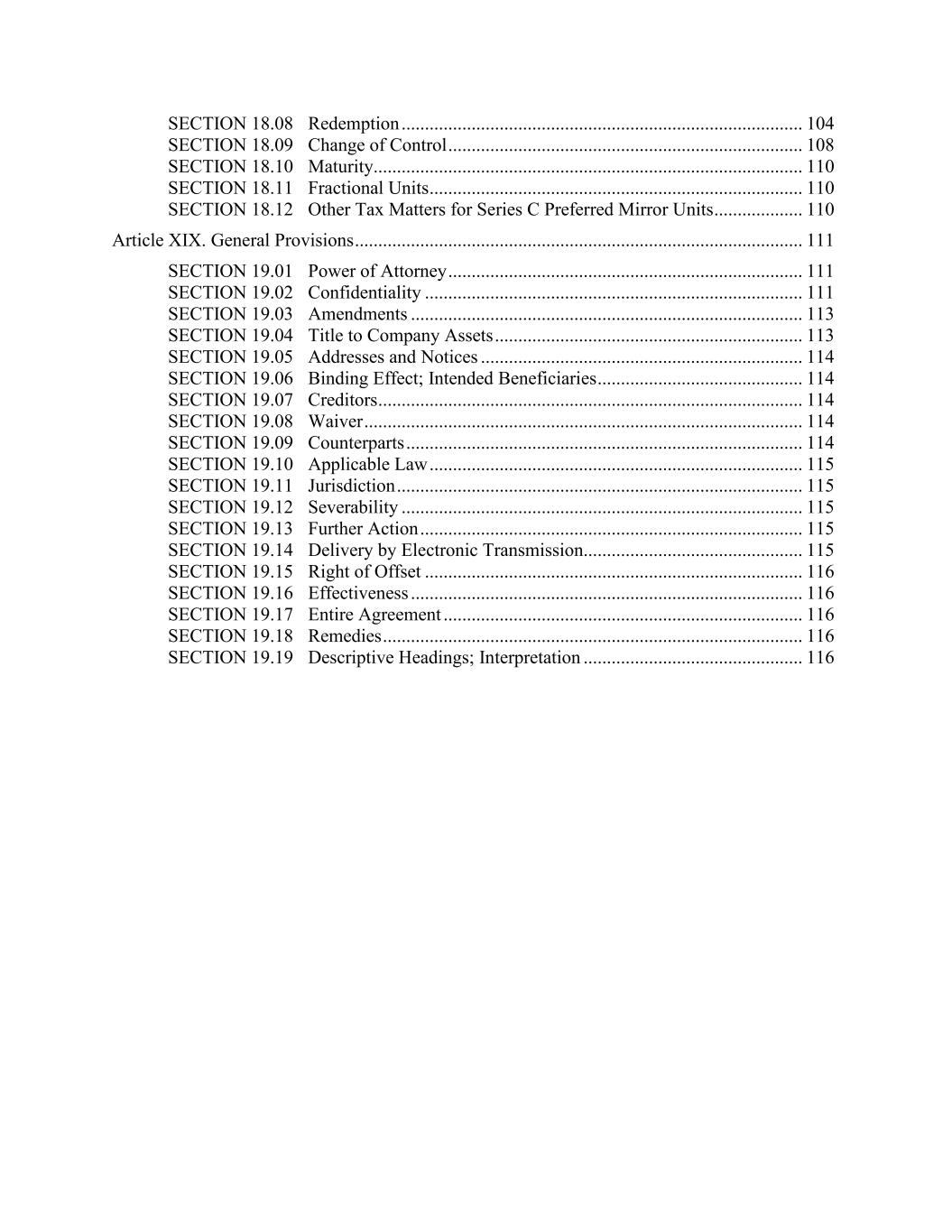 SECTION 18.08 Redemption ...................................................................................... 104 SECTION 18.09 Change of Control ............................................................................ 108 SECTION 18.10 Maturity............................................................................................ 110 SECTION 18.11 Fractional Units ................................................................................ 110 SECTION 18.12 Other Tax Matters for Series C Preferred Mirror Units ................... 110 Article XIX. General Provisions ................................................................................................ 111 SECTION 19.01 Power of Attorney ............................................................................ 111 SECTION 19.02 Confidentiality ................................................................................. 111 SECTION 19.03 Amendments .................................................................................... 113 SECTION 19.04 Title to Company Assets .................................................................. 113 SECTION 19.05 Addresses and Notices ..................................................................... 114 SECTION 19.06 Binding Effect; Intended Beneficiaries ............................................ 114 SECTION 19.07 Creditors ........................................................................................... 114 SECTION 19.08 Waiver .............................................................................................. 114 SECTION 19.09 Counterparts ..................................................................................... 114 SECTION 19.10 Applicable Law ................................................................................ 115 SECTION 19.11 Jurisdiction ....................................................................................... 115 SECTION 19.12 Severability ...................................................................................... 115 SECTION 19.13 Further Action .................................................................................. 115 SECTION 19.14 Delivery by Electronic Transmission............................................... 115 SECTION 19.15 Right of Offset ................................................................................. 116 SECTION 19.16 Effectiveness .................................................................................... 116 SECTION 19.17 Entire Agreement ............................................................................. 116 SECTION 19.18 Remedies .......................................................................................... 116 SECTION 19.19 Descriptive Headings; Interpretation ............................................... 116