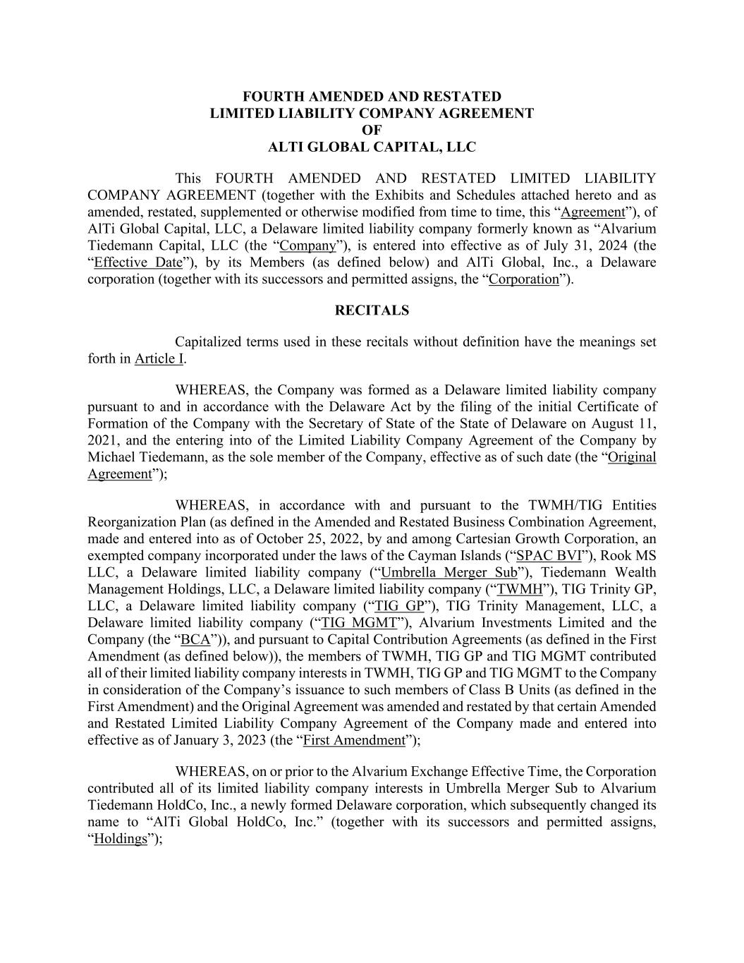 FOURTH AMENDED AND RESTATED LIMITED LIABILITY COMPANY AGREEMENT OF ALTI GLOBAL CAPITAL, LLC This FOURTH AMENDED AND RESTATED LIMITED LIABILITY COMPANY AGREEMENT (together with the Exhibits and Schedules attached hereto and as amended, restated, supplemented or otherwise modified from time to time, this “Agreement”), of AlTi Global Capital, LLC, a Delaware limited liability company formerly known as “Alvarium Tiedemann Capital, LLC (the “Company”), is entered into effective as of July 31, 2024 (the “Effective Date”), by its Members (as defined below) and AlTi Global, Inc., a Delaware corporation (together with its successors and permitted assigns, the “Corporation”). RECITALS Capitalized terms used in these recitals without definition have the meanings set forth in Article I. WHEREAS, the Company was formed as a Delaware limited liability company pursuant to and in accordance with the Delaware Act by the filing of the initial Certificate of Formation of the Company with the Secretary of State of the State of Delaware on August 11, 2021, and the entering into of the Limited Liability Company Agreement of the Company by Michael Tiedemann, as the sole member of the Company, effective as of such date (the “Original Agreement”); WHEREAS, in accordance with and pursuant to the TWMH/TIG Entities Reorganization Plan (as defined in the Amended and Restated Business Combination Agreement, made and entered into as of October 25, 2022, by and among Cartesian Growth Corporation, an exempted company incorporated under the laws of the Cayman Islands (“SPAC BVI”), Rook MS LLC, a Delaware limited liability company (“Umbrella Merger Sub”), Tiedemann Wealth Management Holdings, LLC, a Delaware limited liability company (“TWMH”), TIG Trinity GP, LLC, a Delaware limited liability company (“TIG GP”), TIG Trinity Management, LLC, a Delaware limited liability company (“TIG MGMT”), Alvarium Investments Limited and the Company (the “BCA”)), and pursuant to Capital Contribution Agreements (as defined in the First Amendment (as defined below)), the members of TWMH, TIG GP and TIG MGMT contributed all of their limited liability company interests in TWMH, TIG GP and TIG MGMT to the Company in consideration of the Company’s issuance to such members of Class B Units (as defined in the First Amendment) and the Original Agreement was amended and restated by that certain Amended and Restated Limited Liability Company Agreement of the Company made and entered into effective as of January 3, 2023 (the “First Amendment”); WHEREAS, on or prior to the Alvarium Exchange Effective Time, the Corporation contributed all of its limited liability company interests in Umbrella Merger Sub to Alvarium Tiedemann HoldCo, Inc., a newly formed Delaware corporation, which subsequently changed its name to “AlTi Global HoldCo, Inc.” (together with its successors and permitted assigns, “Holdings”);