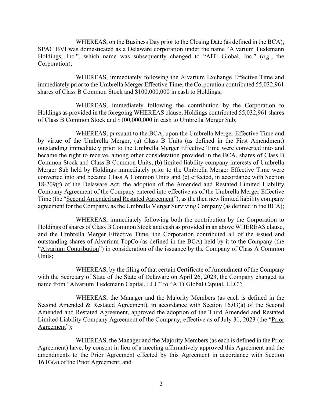 2 WHEREAS, on the Business Day prior to the Closing Date (as defined in the BCA), SPAC BVI was domesticated as a Delaware corporation under the name “Alvarium Tiedemann Holdings, Inc.”, which name was subsequently changed to “AlTi Global, Inc.” (e.g., the Corporation); WHEREAS, immediately following the Alvarium Exchange Effective Time and immediately prior to the Umbrella Merger Effective Time, the Corporation contributed 55,032,961 shares of Class B Common Stock and $100,000,000 in cash to Holdings; WHEREAS, immediately following the contribution by the Corporation to Holdings as provided in the foregoing WHEREAS clause, Holdings contributed 55,032,961 shares of Class B Common Stock and $100,000,000 in cash to Umbrella Merger Sub; WHEREAS, pursuant to the BCA, upon the Umbrella Merger Effective Time and by virtue of the Umbrella Merger, (a) Class B Units (as defined in the First Amendment) outstanding immediately prior to the Umbrella Merger Effective Time were converted into and became the right to receive, among other consideration provided in the BCA, shares of Class B Common Stock and Class B Common Units, (b) limited liability company interests of Umbrella Merger Sub held by Holdings immediately prior to the Umbrella Merger Effective Time were converted into and became Class A Common Units and (c) effected, in accordance with Section 18-209(f) of the Delaware Act, the adoption of the Amended and Restated Limited Liability Company Agreement of the Company entered into effective as of the Umbrella Merger Effective Time (the “Second Amended and Restated Agreement”), as the then new limited liability company agreement for the Company, as the Umbrella Merger Surviving Company (as defined in the BCA); WHEREAS, immediately following both the contribution by the Corporation to Holdings of shares of Class B Common Stock and cash as provided in an above WHEREAS clause, and the Umbrella Merger Effective Time, the Corporation contributed all of the issued and outstanding shares of Alvarium TopCo (as defined in the BCA) held by it to the Company (the “Alvarium Contribution”) in consideration of the issuance by the Company of Class A Common Units; WHEREAS, by the filing of that certain Certificate of Amendment of the Company with the Secretary of State of the State of Delaware on April 26, 2023, the Company changed its name from “Alvarium Tiedemann Capital, LLC” to “AlTi Global Capital, LLC”; WHEREAS, the Manager and the Majority Members (as each is defined in the Second Amended & Restated Agreement), in accordance with Section 16.03(a) of the Second Amended and Restated Agreement, approved the adoption of the Third Amended and Restated Limited Liability Company Agreement of the Company, effective as of July 31, 2023 (the “Prior Agreement”); WHEREAS, the Manager and the Majority Members (as each is defined in the Prior Agreement) have, by consent in lieu of a meeting affirmatively approved this Agreement and the amendments to the Prior Agreement effected by this Agreement in accordance with Section 16.03(a) of the Prior Agreement; and