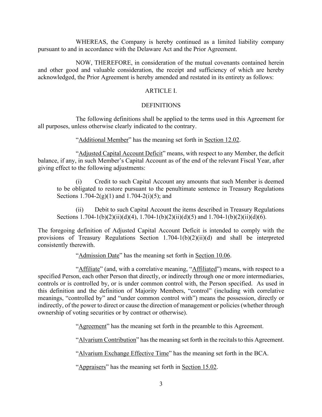3 WHEREAS, the Company is hereby continued as a limited liability company pursuant to and in accordance with the Delaware Act and the Prior Agreement. NOW, THEREFORE, in consideration of the mutual covenants contained herein and other good and valuable consideration, the receipt and sufficiency of which are hereby acknowledged, the Prior Agreement is hereby amended and restated in its entirety as follows: ARTICLE I. DEFINITIONS The following definitions shall be applied to the terms used in this Agreement for all purposes, unless otherwise clearly indicated to the contrary. “Additional Member” has the meaning set forth in Section 12.02. “Adjusted Capital Account Deficit” means, with respect to any Member, the deficit balance, if any, in such Member’s Capital Account as of the end of the relevant Fiscal Year, after giving effect to the following adjustments: (i) Credit to such Capital Account any amounts that such Member is deemed to be obligated to restore pursuant to the penultimate sentence in Treasury Regulations Sections 1.704-2(g)(1) and 1.704-2(i)(5); and (ii) Debit to such Capital Account the items described in Treasury Regulations Sections 1.704-1(b)(2)(ii)(d)(4), 1.704-1(b)(2)(ii)(d)(5) and 1.704-1(b)(2)(ii)(d)(6). The foregoing definition of Adjusted Capital Account Deficit is intended to comply with the provisions of Treasury Regulations Section 1.704-1(b)(2)(ii)(d) and shall be interpreted consistently therewith. “Admission Date” has the meaning set forth in Section 10.06. “Affiliate” (and, with a correlative meaning, “Affiliated”) means, with respect to a specified Person, each other Person that directly, or indirectly through one or more intermediaries, controls or is controlled by, or is under common control with, the Person specified. As used in this definition and the definition of Majority Members, “control” (including with correlative meanings, “controlled by” and “under common control with”) means the possession, directly or indirectly, of the power to direct or cause the direction of management or policies (whether through ownership of voting securities or by contract or otherwise). “Agreement” has the meaning set forth in the preamble to this Agreement. “Alvarium Contribution” has the meaning set forth in the recitals to this Agreement. “Alvarium Exchange Effective Time” has the meaning set forth in the BCA. “Appraisers” has the meaning set forth in Section 15.02.