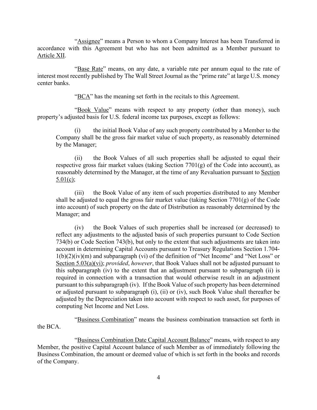 4 “Assignee” means a Person to whom a Company Interest has been Transferred in accordance with this Agreement but who has not been admitted as a Member pursuant to Article XII. “Base Rate” means, on any date, a variable rate per annum equal to the rate of interest most recently published by The Wall Street Journal as the “prime rate” at large U.S. money center banks. “BCA” has the meaning set forth in the recitals to this Agreement. “Book Value” means with respect to any property (other than money), such property’s adjusted basis for U.S. federal income tax purposes, except as follows: (i) the initial Book Value of any such property contributed by a Member to the Company shall be the gross fair market value of such property, as reasonably determined by the Manager; (ii) the Book Values of all such properties shall be adjusted to equal their respective gross fair market values (taking Section 7701(g) of the Code into account), as reasonably determined by the Manager, at the time of any Revaluation pursuant to Section 5.01(c); (iii) the Book Value of any item of such properties distributed to any Member shall be adjusted to equal the gross fair market value (taking Section 7701(g) of the Code into account) of such property on the date of Distribution as reasonably determined by the Manager; and (iv) the Book Values of such properties shall be increased (or decreased) to reflect any adjustments to the adjusted basis of such properties pursuant to Code Section 734(b) or Code Section 743(b), but only to the extent that such adjustments are taken into account in determining Capital Accounts pursuant to Treasury Regulations Section 1.704- 1(b)(2)(iv)(m) and subparagraph (vi) of the definition of “Net Income” and “Net Loss” or Section 5.03(a)(vi); provided, however, that Book Values shall not be adjusted pursuant to this subparagraph (iv) to the extent that an adjustment pursuant to subparagraph (ii) is required in connection with a transaction that would otherwise result in an adjustment pursuant to this subparagraph (iv). If the Book Value of such property has been determined or adjusted pursuant to subparagraph (i), (ii) or (iv), such Book Value shall thereafter be adjusted by the Depreciation taken into account with respect to such asset, for purposes of computing Net Income and Net Loss. “Business Combination” means the business combination transaction set forth in the BCA. “Business Combination Date Capital Account Balance” means, with respect to any Member, the positive Capital Account balance of such Member as of immediately following the Business Combination, the amount or deemed value of which is set forth in the books and records of the Company.