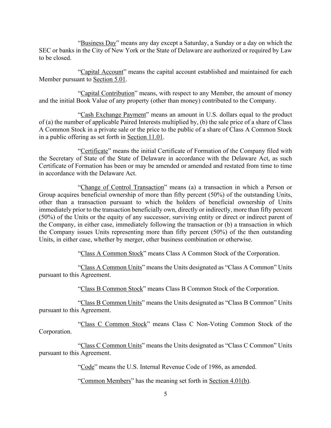 5 “Business Day” means any day except a Saturday, a Sunday or a day on which the SEC or banks in the City of New York or the State of Delaware are authorized or required by Law to be closed. “Capital Account” means the capital account established and maintained for each Member pursuant to Section 5.01. “Capital Contribution” means, with respect to any Member, the amount of money and the initial Book Value of any property (other than money) contributed to the Company. “Cash Exchange Payment” means an amount in U.S. dollars equal to the product of (a) the number of applicable Paired Interests multiplied by, (b) the sale price of a share of Class A Common Stock in a private sale or the price to the public of a share of Class A Common Stock in a public offering as set forth in Section 11.01. “Certificate” means the initial Certificate of Formation of the Company filed with the Secretary of State of the State of Delaware in accordance with the Delaware Act, as such Certificate of Formation has been or may be amended or amended and restated from time to time in accordance with the Delaware Act. “Change of Control Transaction” means (a) a transaction in which a Person or Group acquires beneficial ownership of more than fifty percent (50%) of the outstanding Units, other than a transaction pursuant to which the holders of beneficial ownership of Units immediately prior to the transaction beneficially own, directly or indirectly, more than fifty percent (50%) of the Units or the equity of any successor, surviving entity or direct or indirect parent of the Company, in either case, immediately following the transaction or (b) a transaction in which the Company issues Units representing more than fifty percent (50%) of the then outstanding Units, in either case, whether by merger, other business combination or otherwise. “Class A Common Stock” means Class A Common Stock of the Corporation. “Class A Common Units” means the Units designated as “Class A Common” Units pursuant to this Agreement. “Class B Common Stock” means Class B Common Stock of the Corporation. “Class B Common Units” means the Units designated as “Class B Common” Units pursuant to this Agreement. “Class C Common Stock” means Class C Non-Voting Common Stock of the Corporation. “Class C Common Units” means the Units designated as “Class C Common” Units pursuant to this Agreement. “Code” means the U.S. Internal Revenue Code of 1986, as amended. “Common Members” has the meaning set forth in Section 4.01(b).