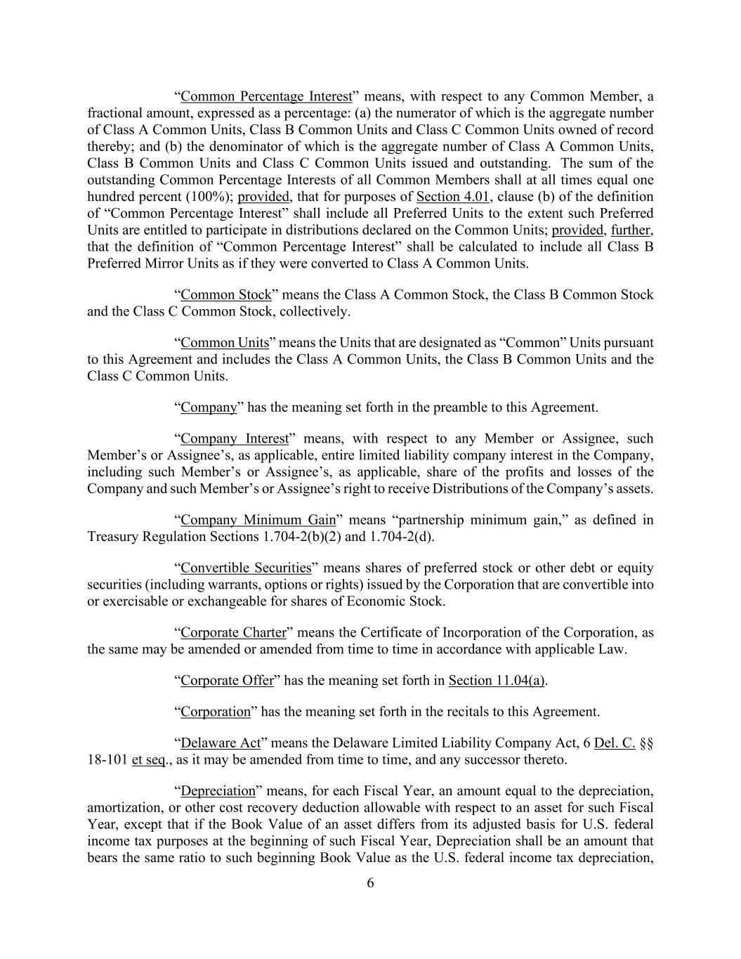 6 “Common Percentage Interest” means, with respect to any Common Member, a fractional amount, expressed as a percentage: (a) the numerator of which is the aggregate number of Class A Common Units, Class B Common Units and Class C Common Units owned of record thereby; and (b) the denominator of which is the aggregate number of Class A Common Units, Class B Common Units and Class C Common Units issued and outstanding. The sum of the outstanding Common Percentage Interests of all Common Members shall at all times equal one hundred percent (100%); provided, that for purposes of Section 4.01, clause (b) of the definition of “Common Percentage Interest” shall include all Preferred Units to the extent such Preferred Units are entitled to participate in distributions declared on the Common Units; provided, further, that the definition of “Common Percentage Interest” shall be calculated to include all Class B Preferred Mirror Units as if they were converted to Class A Common Units. “Common Stock” means the Class A Common Stock, the Class B Common Stock and the Class C Common Stock, collectively. “Common Units” means the Units that are designated as “Common” Units pursuant to this Agreement and includes the Class A Common Units, the Class B Common Units and the Class C Common Units. “Company” has the meaning set forth in the preamble to this Agreement. “Company Interest” means, with respect to any Member or Assignee, such Member’s or Assignee’s, as applicable, entire limited liability company interest in the Company, including such Member’s or Assignee’s, as applicable, share of the profits and losses of the Company and such Member’s or Assignee’s right to receive Distributions of the Company’s assets. “Company Minimum Gain” means “partnership minimum gain,” as defined in Treasury Regulation Sections 1.704-2(b)(2) and 1.704-2(d). “Convertible Securities” means shares of preferred stock or other debt or equity securities (including warrants, options or rights) issued by the Corporation that are convertible into or exercisable or exchangeable for shares of Economic Stock. “Corporate Charter” means the Certificate of Incorporation of the Corporation, as the same may be amended or amended from time to time in accordance with applicable Law. “Corporate Offer” has the meaning set forth in Section 11.04(a). “Corporation” has the meaning set forth in the recitals to this Agreement. “Delaware Act” means the Delaware Limited Liability Company Act, 6 Del. C. §§ 18-101 et seq., as it may be amended from time to time, and any successor thereto. “Depreciation” means, for each Fiscal Year, an amount equal to the depreciation, amortization, or other cost recovery deduction allowable with respect to an asset for such Fiscal Year, except that if the Book Value of an asset differs from its adjusted basis for U.S. federal income tax purposes at the beginning of such Fiscal Year, Depreciation shall be an amount that bears the same ratio to such beginning Book Value as the U.S. federal income tax depreciation,