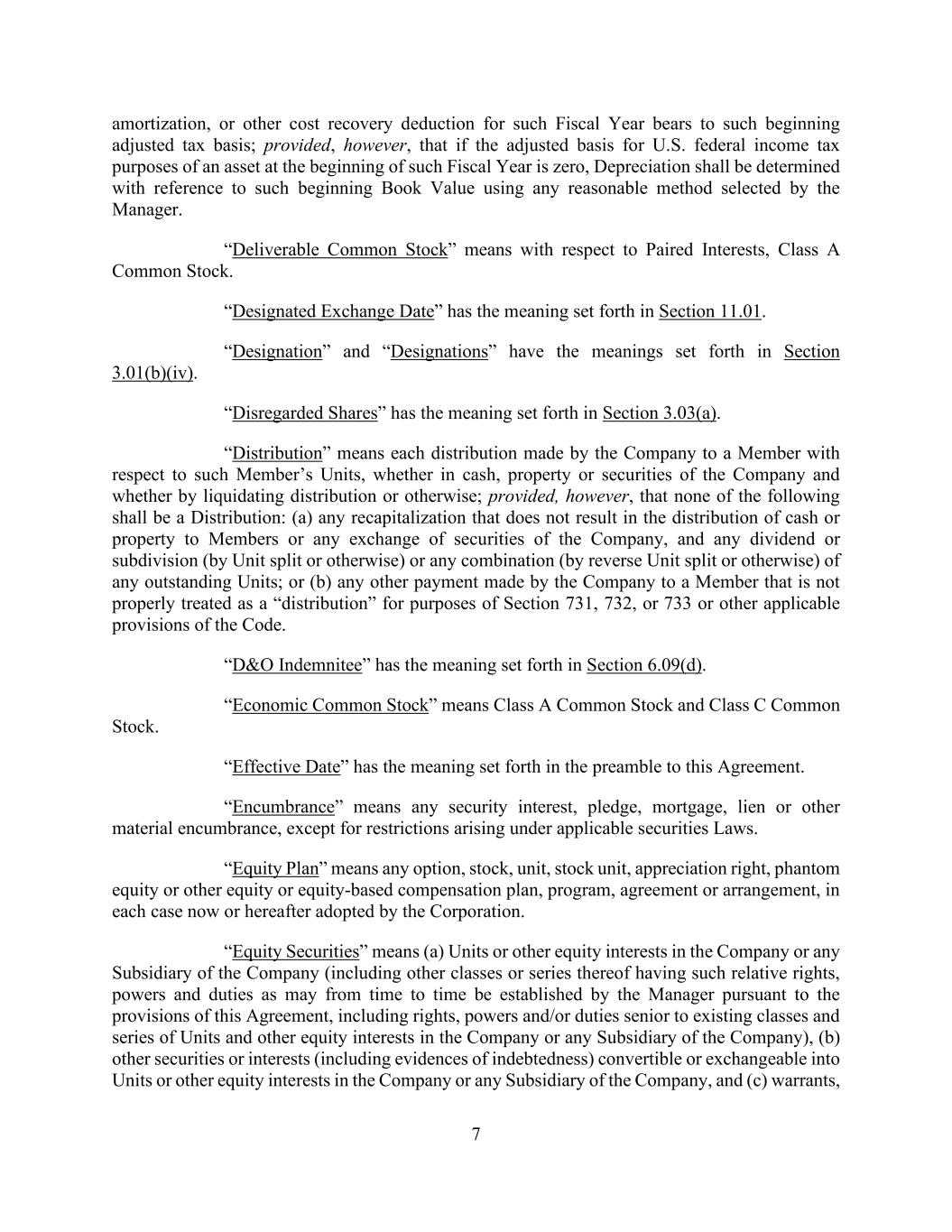 7 amortization, or other cost recovery deduction for such Fiscal Year bears to such beginning adjusted tax basis; provided, however, that if the adjusted basis for U.S. federal income tax purposes of an asset at the beginning of such Fiscal Year is zero, Depreciation shall be determined with reference to such beginning Book Value using any reasonable method selected by the Manager. “Deliverable Common Stock” means with respect to Paired Interests, Class A Common Stock. “Designated Exchange Date” has the meaning set forth in Section 11.01. “Designation” and “Designations” have the meanings set forth in Section 3.01(b)(iv). “Disregarded Shares” has the meaning set forth in Section 3.03(a). “Distribution” means each distribution made by the Company to a Member with respect to such Member’s Units, whether in cash, property or securities of the Company and whether by liquidating distribution or otherwise; provided, however, that none of the following shall be a Distribution: (a) any recapitalization that does not result in the distribution of cash or property to Members or any exchange of securities of the Company, and any dividend or subdivision (by Unit split or otherwise) or any combination (by reverse Unit split or otherwise) of any outstanding Units; or (b) any other payment made by the Company to a Member that is not properly treated as a “distribution” for purposes of Section 731, 732, or 733 or other applicable provisions of the Code. “D&O Indemnitee” has the meaning set forth in Section 6.09(d). “Economic Common Stock” means Class A Common Stock and Class C Common Stock. “Effective Date” has the meaning set forth in the preamble to this Agreement. “Encumbrance” means any security interest, pledge, mortgage, lien or other material encumbrance, except for restrictions arising under applicable securities Laws. “Equity Plan” means any option, stock, unit, stock unit, appreciation right, phantom equity or other equity or equity-based compensation plan, program, agreement or arrangement, in each case now or hereafter adopted by the Corporation. “Equity Securities” means (a) Units or other equity interests in the Company or any Subsidiary of the Company (including other classes or series thereof having such relative rights, powers and duties as may from time to time be established by the Manager pursuant to the provisions of this Agreement, including rights, powers and/or duties senior to existing classes and series of Units and other equity interests in the Company or any Subsidiary of the Company), (b) other securities or interests (including evidences of indebtedness) convertible or exchangeable into Units or other equity interests in the Company or any Subsidiary of the Company, and (c) warrants,