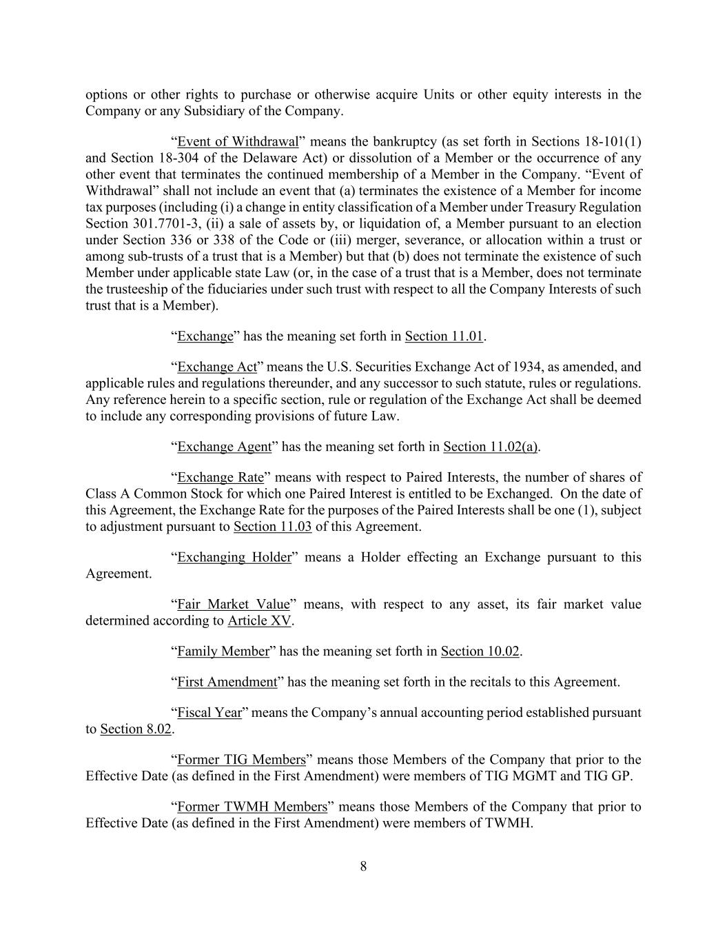 8 options or other rights to purchase or otherwise acquire Units or other equity interests in the Company or any Subsidiary of the Company. “Event of Withdrawal” means the bankruptcy (as set forth in Sections 18-101(1) and Section 18-304 of the Delaware Act) or dissolution of a Member or the occurrence of any other event that terminates the continued membership of a Member in the Company. “Event of Withdrawal” shall not include an event that (a) terminates the existence of a Member for income tax purposes (including (i) a change in entity classification of a Member under Treasury Regulation Section 301.7701-3, (ii) a sale of assets by, or liquidation of, a Member pursuant to an election under Section 336 or 338 of the Code or (iii) merger, severance, or allocation within a trust or among sub-trusts of a trust that is a Member) but that (b) does not terminate the existence of such Member under applicable state Law (or, in the case of a trust that is a Member, does not terminate the trusteeship of the fiduciaries under such trust with respect to all the Company Interests of such trust that is a Member). “Exchange” has the meaning set forth in Section 11.01. “Exchange Act” means the U.S. Securities Exchange Act of 1934, as amended, and applicable rules and regulations thereunder, and any successor to such statute, rules or regulations. Any reference herein to a specific section, rule or regulation of the Exchange Act shall be deemed to include any corresponding provisions of future Law. “Exchange Agent” has the meaning set forth in Section 11.02(a). “Exchange Rate” means with respect to Paired Interests, the number of shares of Class A Common Stock for which one Paired Interest is entitled to be Exchanged. On the date of this Agreement, the Exchange Rate for the purposes of the Paired Interests shall be one (1), subject to adjustment pursuant to Section 11.03 of this Agreement. “Exchanging Holder” means a Holder effecting an Exchange pursuant to this Agreement. “Fair Market Value” means, with respect to any asset, its fair market value determined according to Article XV. “Family Member” has the meaning set forth in Section 10.02. “First Amendment” has the meaning set forth in the recitals to this Agreement. “Fiscal Year” means the Company’s annual accounting period established pursuant to Section 8.02. “Former TIG Members” means those Members of the Company that prior to the Effective Date (as defined in the First Amendment) were members of TIG MGMT and TIG GP. “Former TWMH Members” means those Members of the Company that prior to Effective Date (as defined in the First Amendment) were members of TWMH.