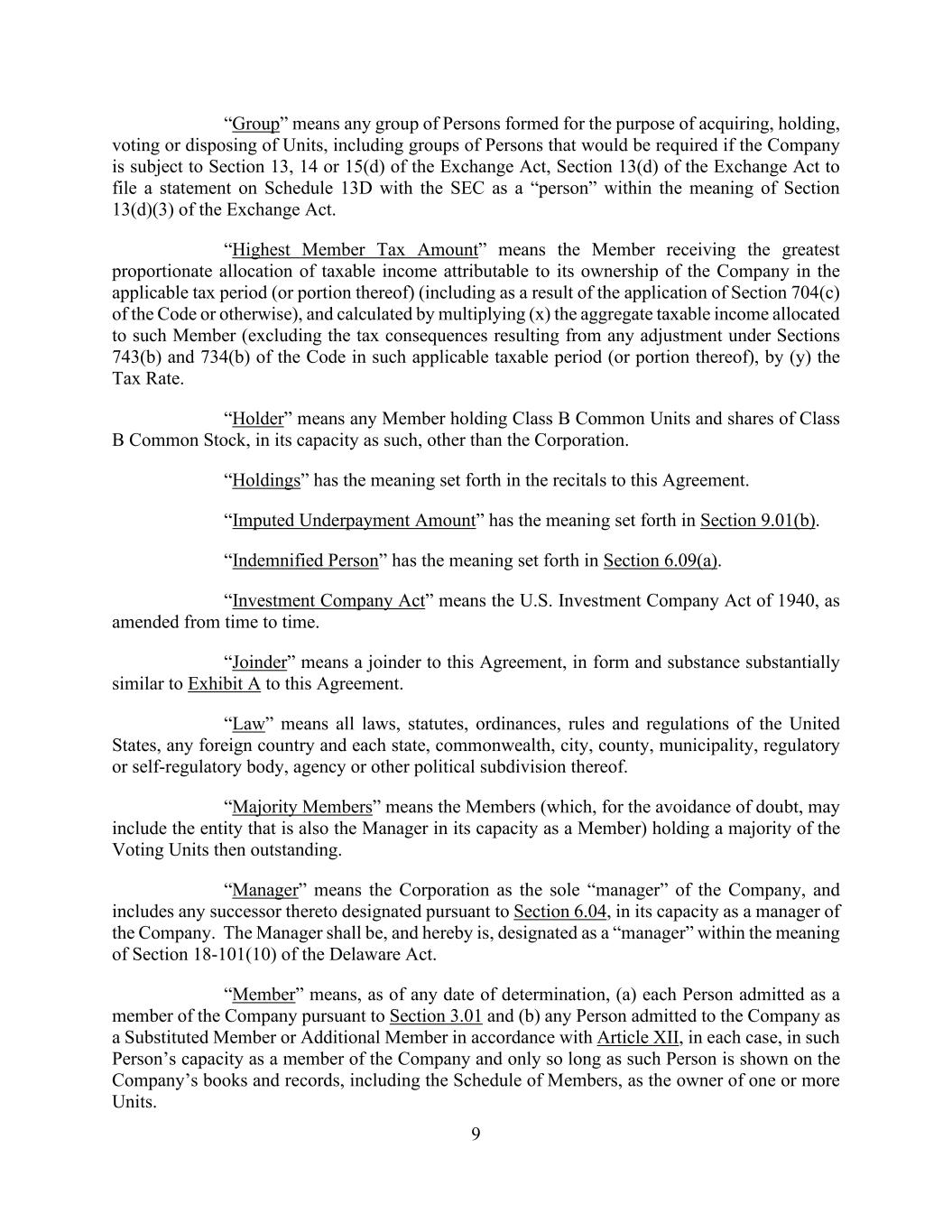 9 “Group” means any group of Persons formed for the purpose of acquiring, holding, voting or disposing of Units, including groups of Persons that would be required if the Company is subject to Section 13, 14 or 15(d) of the Exchange Act, Section 13(d) of the Exchange Act to file a statement on Schedule 13D with the SEC as a “person” within the meaning of Section 13(d)(3) of the Exchange Act. “Highest Member Tax Amount” means the Member receiving the greatest proportionate allocation of taxable income attributable to its ownership of the Company in the applicable tax period (or portion thereof) (including as a result of the application of Section 704(c) of the Code or otherwise), and calculated by multiplying (x) the aggregate taxable income allocated to such Member (excluding the tax consequences resulting from any adjustment under Sections 743(b) and 734(b) of the Code in such applicable taxable period (or portion thereof), by (y) the Tax Rate. “Holder” means any Member holding Class B Common Units and shares of Class B Common Stock, in its capacity as such, other than the Corporation. “Holdings” has the meaning set forth in the recitals to this Agreement. “Imputed Underpayment Amount” has the meaning set forth in Section 9.01(b). “Indemnified Person” has the meaning set forth in Section 6.09(a). “Investment Company Act” means the U.S. Investment Company Act of 1940, as amended from time to time. “Joinder” means a joinder to this Agreement, in form and substance substantially similar to Exhibit A to this Agreement. “Law” means all laws, statutes, ordinances, rules and regulations of the United States, any foreign country and each state, commonwealth, city, county, municipality, regulatory or self-regulatory body, agency or other political subdivision thereof. “Majority Members” means the Members (which, for the avoidance of doubt, may include the entity that is also the Manager in its capacity as a Member) holding a majority of the Voting Units then outstanding. “Manager” means the Corporation as the sole “manager” of the Company, and includes any successor thereto designated pursuant to Section 6.04, in its capacity as a manager of the Company. The Manager shall be, and hereby is, designated as a “manager” within the meaning of Section 18-101(10) of the Delaware Act. “Member” means, as of any date of determination, (a) each Person admitted as a member of the Company pursuant to Section 3.01 and (b) any Person admitted to the Company as a Substituted Member or Additional Member in accordance with Article XII, in each case, in such Person’s capacity as a member of the Company and only so long as such Person is shown on the Company’s books and records, including the Schedule of Members, as the owner of one or more Units.