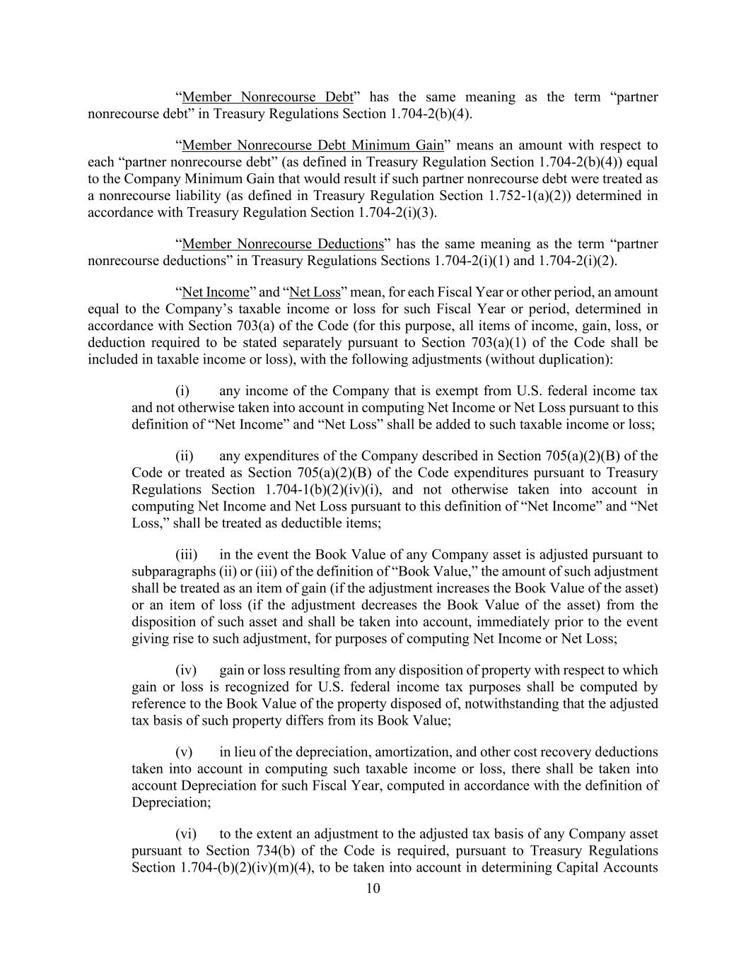 10 “Member Nonrecourse Debt” has the same meaning as the term “partner nonrecourse debt” in Treasury Regulations Section 1.704-2(b)(4). “Member Nonrecourse Debt Minimum Gain” means an amount with respect to each “partner nonrecourse debt” (as defined in Treasury Regulation Section 1.704-2(b)(4)) equal to the Company Minimum Gain that would result if such partner nonrecourse debt were treated as a nonrecourse liability (as defined in Treasury Regulation Section 1.752-1(a)(2)) determined in accordance with Treasury Regulation Section 1.704-2(i)(3). “Member Nonrecourse Deductions” has the same meaning as the term “partner nonrecourse deductions” in Treasury Regulations Sections 1.704-2(i)(1) and 1.704-2(i)(2). “Net Income” and “Net Loss” mean, for each Fiscal Year or other period, an amount equal to the Company’s taxable income or loss for such Fiscal Year or period, determined in accordance with Section 703(a) of the Code (for this purpose, all items of income, gain, loss, or deduction required to be stated separately pursuant to Section 703(a)(1) of the Code shall be included in taxable income or loss), with the following adjustments (without duplication): (i) any income of the Company that is exempt from U.S. federal income tax and not otherwise taken into account in computing Net Income or Net Loss pursuant to this definition of “Net Income” and “Net Loss” shall be added to such taxable income or loss; (ii) any expenditures of the Company described in Section 705(a)(2)(B) of the Code or treated as Section 705(a)(2)(B) of the Code expenditures pursuant to Treasury Regulations Section 1.704-1(b)(2)(iv)(i), and not otherwise taken into account in computing Net Income and Net Loss pursuant to this definition of “Net Income” and “Net Loss,” shall be treated as deductible items; (iii) in the event the Book Value of any Company asset is adjusted pursuant to subparagraphs (ii) or (iii) of the definition of “Book Value,” the amount of such adjustment shall be treated as an item of gain (if the adjustment increases the Book Value of the asset) or an item of loss (if the adjustment decreases the Book Value of the asset) from the disposition of such asset and shall be taken into account, immediately prior to the event giving rise to such adjustment, for purposes of computing Net Income or Net Loss; (iv) gain or loss resulting from any disposition of property with respect to which gain or loss is recognized for U.S. federal income tax purposes shall be computed by reference to the Book Value of the property disposed of, notwithstanding that the adjusted tax basis of such property differs from its Book Value; (v) in lieu of the depreciation, amortization, and other cost recovery deductions taken into account in computing such taxable income or loss, there shall be taken into account Depreciation for such Fiscal Year, computed in accordance with the definition of Depreciation; (vi) to the extent an adjustment to the adjusted tax basis of any Company asset pursuant to Section 734(b) of the Code is required, pursuant to Treasury Regulations Section 1.704-(b)(2)(iv)(m)(4), to be taken into account in determining Capital Accounts