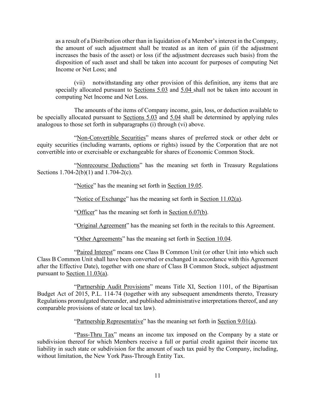 11 as a result of a Distribution other than in liquidation of a Member’s interest in the Company, the amount of such adjustment shall be treated as an item of gain (if the adjustment increases the basis of the asset) or loss (if the adjustment decreases such basis) from the disposition of such asset and shall be taken into account for purposes of computing Net Income or Net Loss; and (vii) notwithstanding any other provision of this definition, any items that are specially allocated pursuant to Sections 5.03 and 5.04 shall not be taken into account in computing Net Income and Net Loss. The amounts of the items of Company income, gain, loss, or deduction available to be specially allocated pursuant to Sections 5.03 and 5.04 shall be determined by applying rules analogous to those set forth in subparagraphs (i) through (vi) above. “Non-Convertible Securities” means shares of preferred stock or other debt or equity securities (including warrants, options or rights) issued by the Corporation that are not convertible into or exercisable or exchangeable for shares of Economic Common Stock. “Nonrecourse Deductions” has the meaning set forth in Treasury Regulations Sections 1.704-2(b)(1) and 1.704-2(c). “Notice” has the meaning set forth in Section 19.05. “Notice of Exchange” has the meaning set forth in Section 11.02(a). “Officer” has the meaning set forth in Section 6.07(b). “Original Agreement” has the meaning set forth in the recitals to this Agreement. “Other Agreements” has the meaning set forth in Section 10.04. “Paired Interest” means one Class B Common Unit (or other Unit into which such Class B Common Unit shall have been converted or exchanged in accordance with this Agreement after the Effective Date), together with one share of Class B Common Stock, subject adjustment pursuant to Section 11.03(a). “Partnership Audit Provisions” means Title XI, Section 1101, of the Bipartisan Budget Act of 2015, P.L. 114-74 (together with any subsequent amendments thereto, Treasury Regulations promulgated thereunder, and published administrative interpretations thereof, and any comparable provisions of state or local tax law). “Partnership Representative” has the meaning set forth in Section 9.01(a). “Pass-Thru Tax” means an income tax imposed on the Company by a state or subdivision thereof for which Members receive a full or partial credit against their income tax liability in such state or subdivision for the amount of such tax paid by the Company, including, without limitation, the New York Pass-Through Entity Tax.