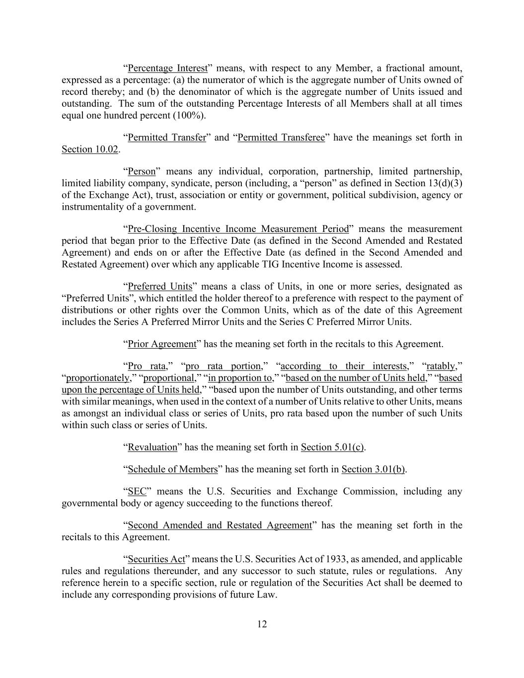 12 “Percentage Interest” means, with respect to any Member, a fractional amount, expressed as a percentage: (a) the numerator of which is the aggregate number of Units owned of record thereby; and (b) the denominator of which is the aggregate number of Units issued and outstanding. The sum of the outstanding Percentage Interests of all Members shall at all times equal one hundred percent (100%). “Permitted Transfer” and “Permitted Transferee” have the meanings set forth in Section 10.02. “Person” means any individual, corporation, partnership, limited partnership, limited liability company, syndicate, person (including, a “person” as defined in Section 13(d)(3) of the Exchange Act), trust, association or entity or government, political subdivision, agency or instrumentality of a government. “Pre-Closing Incentive Income Measurement Period” means the measurement period that began prior to the Effective Date (as defined in the Second Amended and Restated Agreement) and ends on or after the Effective Date (as defined in the Second Amended and Restated Agreement) over which any applicable TIG Incentive Income is assessed. “Preferred Units” means a class of Units, in one or more series, designated as “Preferred Units”, which entitled the holder thereof to a preference with respect to the payment of distributions or other rights over the Common Units, which as of the date of this Agreement includes the Series A Preferred Mirror Units and the Series C Preferred Mirror Units. “Prior Agreement” has the meaning set forth in the recitals to this Agreement. “Pro rata,” “pro rata portion,” “according to their interests,” “ratably,” “proportionately,” “proportional,” “in proportion to,” “based on the number of Units held,” “based upon the percentage of Units held,” “based upon the number of Units outstanding, and other terms with similar meanings, when used in the context of a number of Units relative to other Units, means as amongst an individual class or series of Units, pro rata based upon the number of such Units within such class or series of Units. “Revaluation” has the meaning set forth in Section 5.01(c). “Schedule of Members” has the meaning set forth in Section 3.01(b). “SEC” means the U.S. Securities and Exchange Commission, including any governmental body or agency succeeding to the functions thereof. “Second Amended and Restated Agreement” has the meaning set forth in the recitals to this Agreement. “Securities Act” means the U.S. Securities Act of 1933, as amended, and applicable rules and regulations thereunder, and any successor to such statute, rules or regulations. Any reference herein to a specific section, rule or regulation of the Securities Act shall be deemed to include any corresponding provisions of future Law.